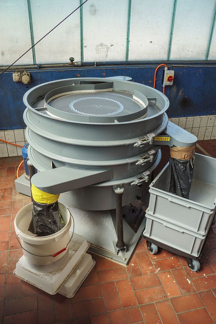 Sobald das Aufzuchtsubstrat vollständig umgewandelt ist, wird der Inhalt der Boxen auf einen Siebrüttler geleert, um die Larven vom Restsubstrat zu trennen. Die Larven kommen dann in die Verarbeitung und das Restsubstrat wird zu Dünger weiterverarbeitet.