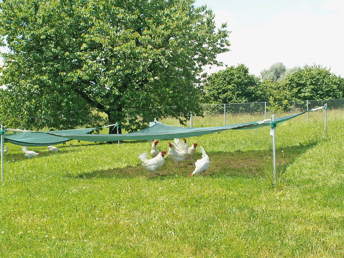 Damit die Legehennen den stallnahen Bereich verlassen und sich möglichst gut auf der ganzen Weidefläche verteilen, müssen genügend Struktur-Elemente vorhanden sein. Neben Bäumen oder Büschen eignen sich künstliche Strukturen, zum Beispiel Schattennetze oder gedeckte Sandbäder. Letztere bieten den Hennen einen attraktiven Platz zum Scharren und Sandbaden und können somit helfen, die Beanspruchung der Weide zu reduzieren.
