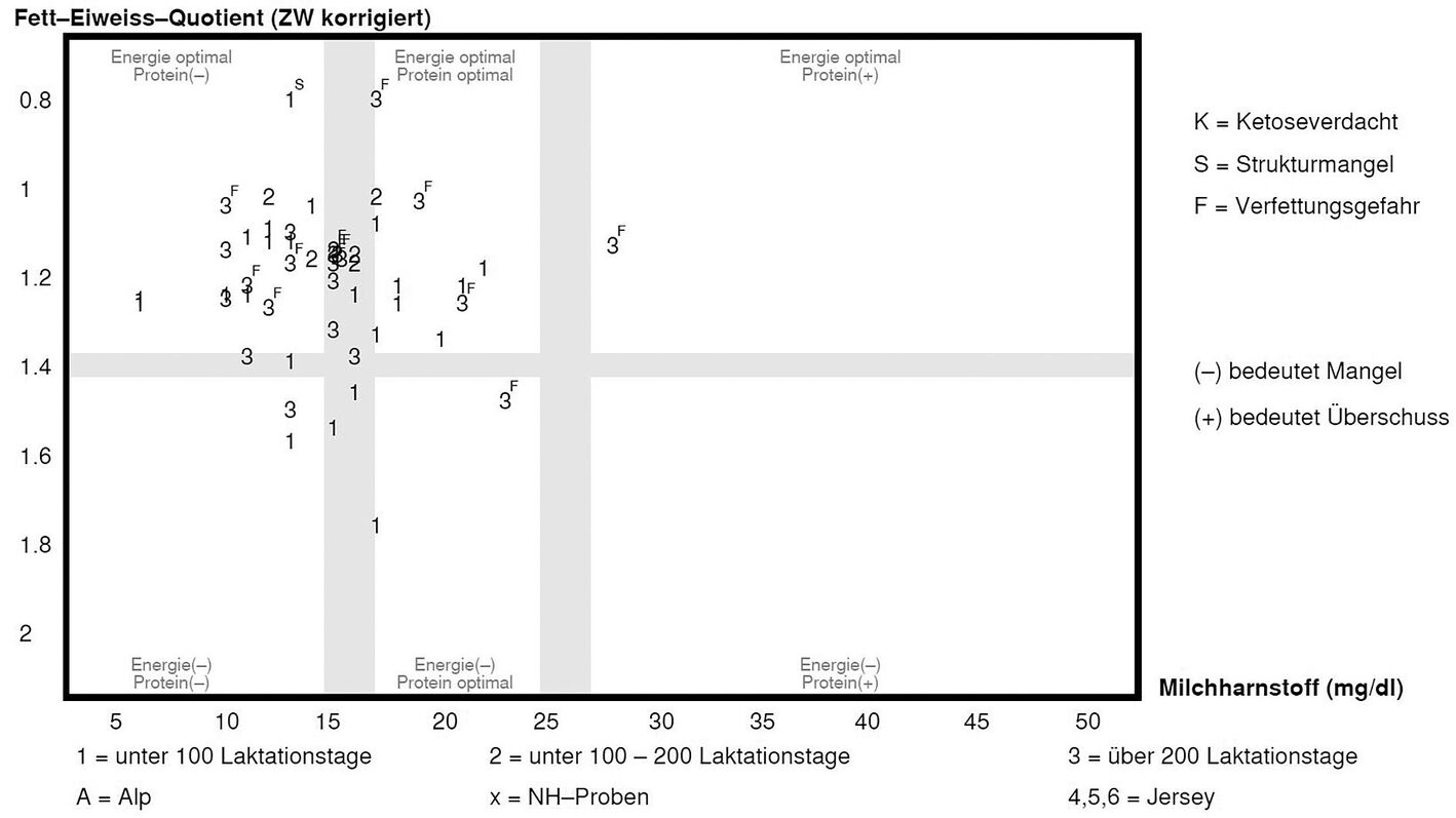 - Die Kühe werden neu auf einer 6-Felder-Tafel eingeteilt. Die senkrechte Achse zeigt den Fett-Eiweiss-Quotient (FEQ) an. In Anlehnung an die frühere 9-Felder-Tafel wurde die Achse «umgedreht»: So liegen Kühe mit Energiemangel und folglich hohem FEQ unten links. Die Grenze, bei der von einem Energiemangel gesprochen wird, unterscheidet sich zwischen drei Gruppen: