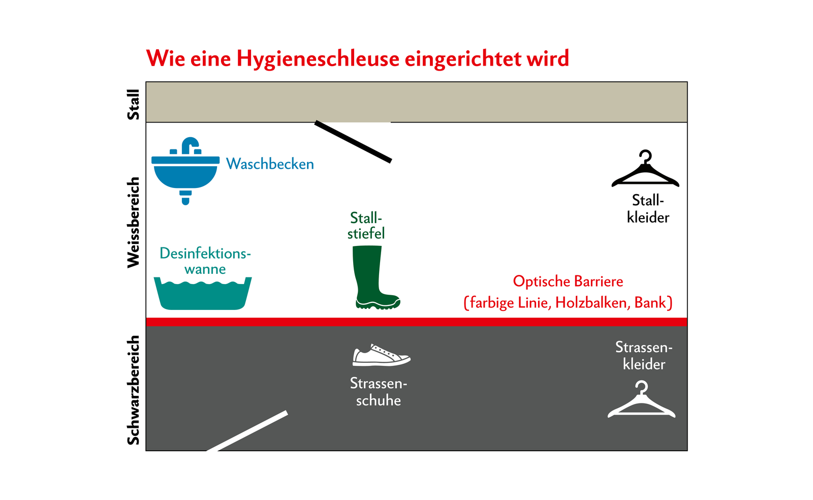 Thomas Barmettler empfiehlt daher, dass der Betriebsleiter bei jedem Stalleingang optisch einen Schwarz-Weiss-Bereich markiert (siehe Illustration). Dies zum Beispiel mittels farbigem Rechteck auf dem Boden, in welchem die Strassenschuhe ausgezogen werden. Im Weissbereich steht dann ein neues Paar Stiefel für jeden Stall bereit.