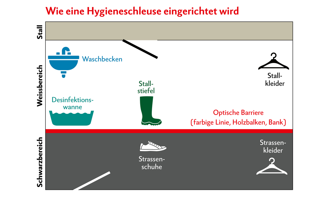 - Schleuse vorhanden (vor jedem Stalleingang, sodass ein klarer Schwarz-Weiss-Bereich entsteht).