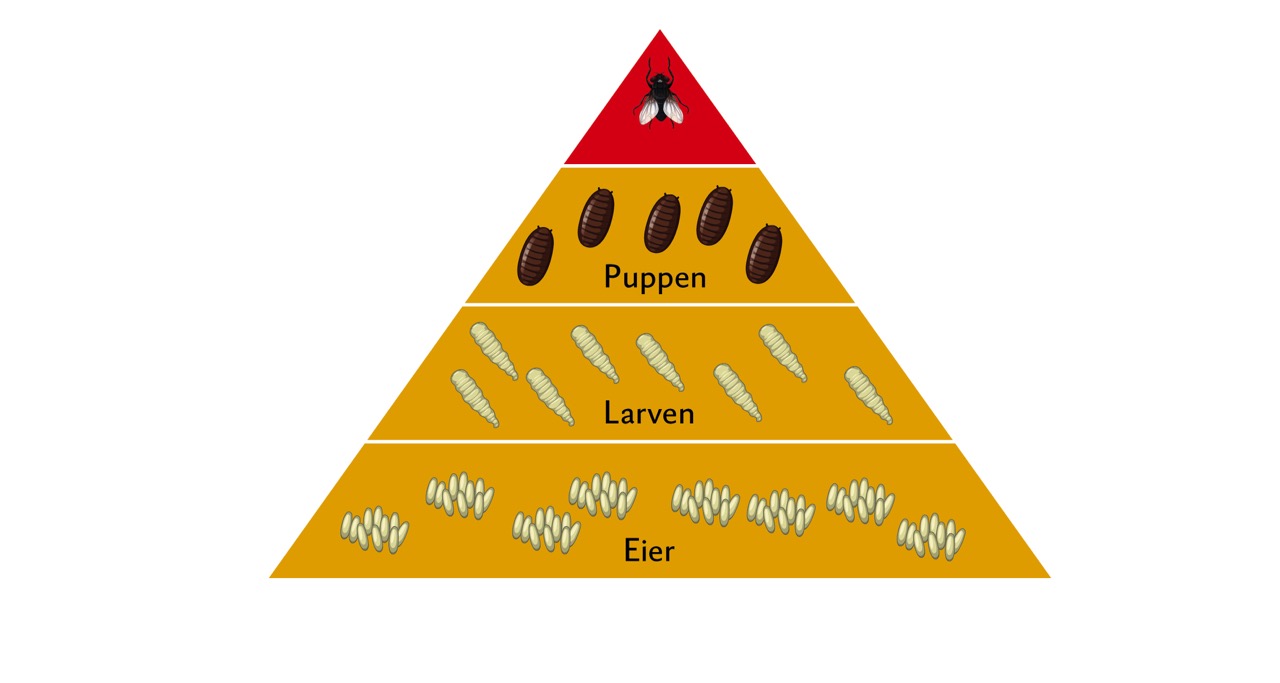 Durch die «guten» Umgebungsbedingungen in Ställen sind bis zu 15 Generationen pro Jahr möglich. Jede weibliche Fliege kann bis zu 2000 Eier ablegen. Eine überwinternde Fliege schafft also bis zu 25 Mio Nachkommen im Jahr.