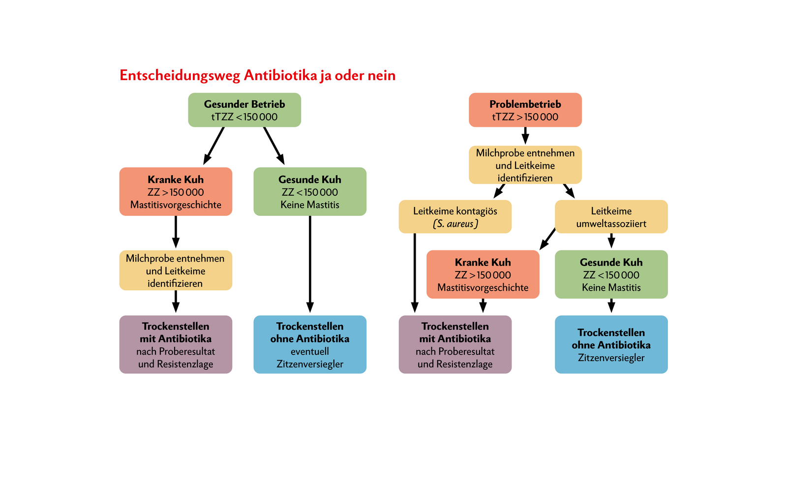 Liegt die tTZZ über 150 000 Zellen/ml, soll für eine erfolgreiche Bekämpfung der Leitkeim analysiert werden. Ist dies ein Kuh-assoziierter Keim wie zum Beispiel Staphylococcus aureus, insbesondere der Genotyp B, sollen alle Kühe antibiotisch trockengestellt werden. Dies, weil der genannte Erreger sehr ansteckend ist und rasch zu einem Herdenproblem mit Euterentzündungen führen kann. Gerade bei Erregern, die häufig Resistenzen aufweisen (unter anderem Staph spp.) sollen diese auch überprüft werden, um dann mit einem spezifischen, noch wirksamen Antibiotikum behandeln zu können.