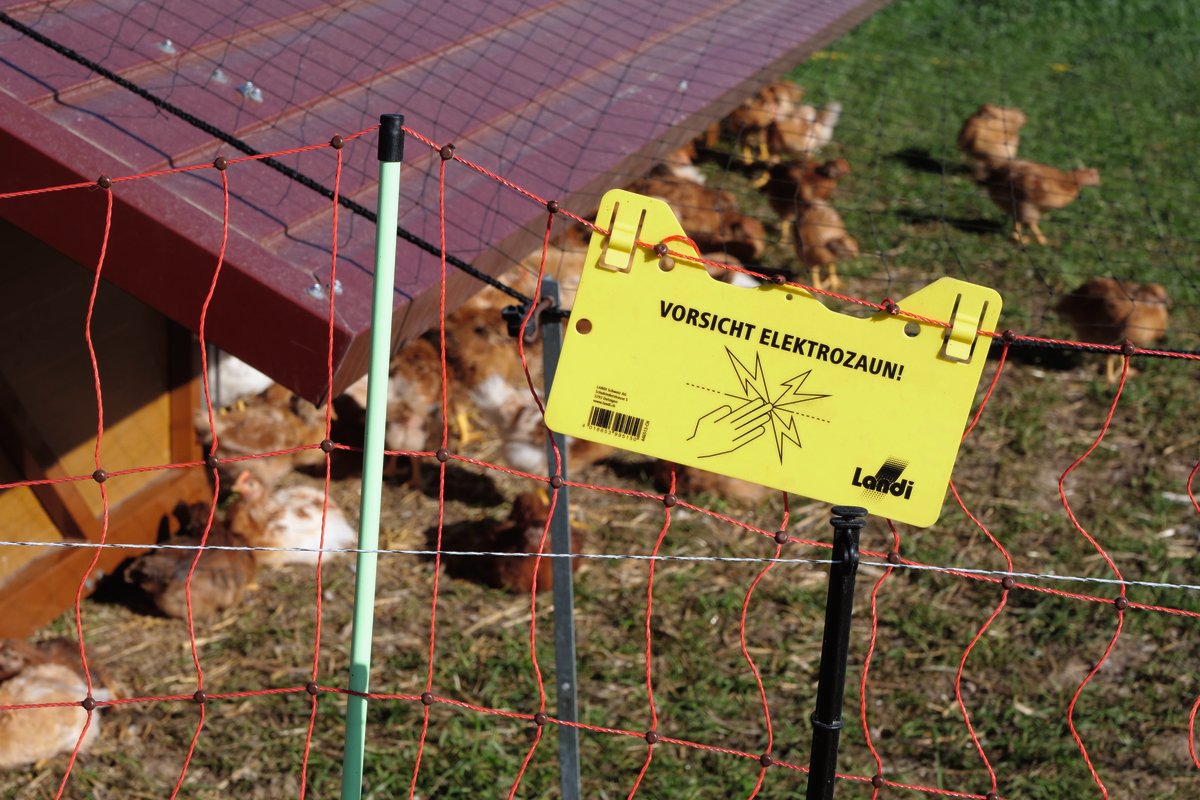 Die Luxusvariante besteht bei Steiner aus einem Netz, damit die Hühner innerhalb des Zaunes bleiben. In einem Abstand von etwa 40 cm gegen aussen hat es einen weiteren Zaun mit vier Drähten. «Dieser ist gegen den Fuchs», erklärt Steiner. Tagsüber ist nur das Netz am Strom, in der Nacht sind beide Zäune aktiv.