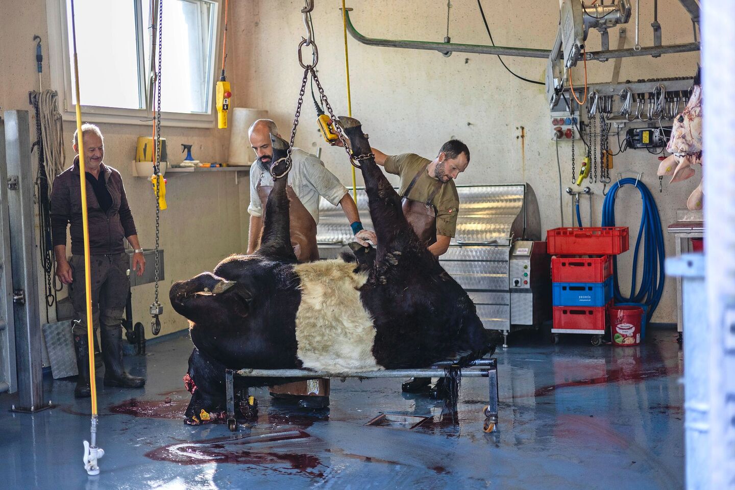 Bereits 2023 veröffentlichte das Forschungsinstitut für Biologischen Landbau (FiBL) eine Studie, in der grosse Unterschiede in den stressanzeigenden Parametern im Blut von im Schlachthof geschlachteten und auf dem landwirtschaftlichen Betrieb getöteten Rindern festgestellt wurden. Während Letztere stressanzeigende Cortisolwerte im Blut nahe am Normalzustand hatten, waren die Cortisolwerte der Tiere im Schlachthof zwanzigmal höher. «Ähnliche Ergebnisse liessen sich auch bei einem Vergleich zwischen Weideschuss und Schlachtungen im Schlachthof bei einer Studie aus dem Jahr 2017 feststellen», schreibt das FiBL in einem Merkblatt zur Hof- und Weidetötung. Das ist nur einer der Gründe, warum sich viele Landwirte für die Hoftötung einsetzen und diese in der Schweiz immer mehr durchgeführt wird. So auch auf dem Bauernhof «Zur chalte Hose» am Küsnachter Berg bei Zürich, der von Nils Müller und seiner Familie geführt wird.