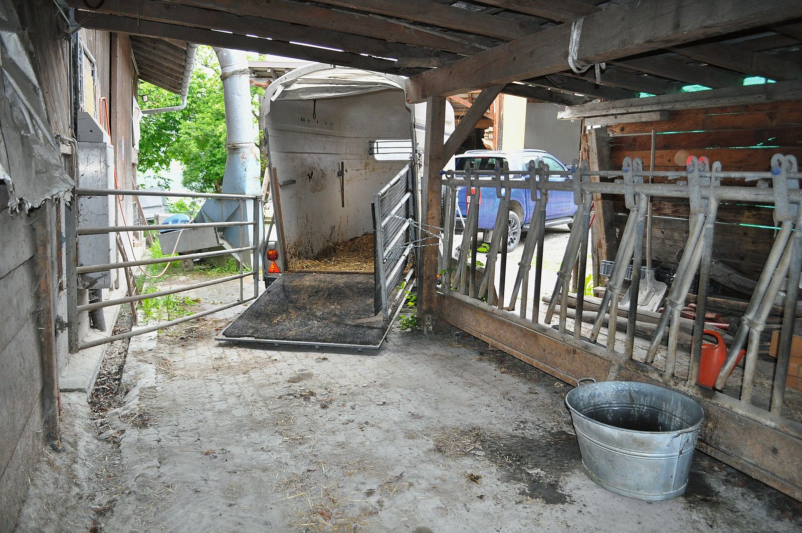 «Er ist etwas unruhig heute», bemerkt sie. Etwas zaghaft versucht sie, Pierro mit einem Schaufelstiel in Richtung Anhänger zu bewegen, aber er ignoriert es. Er spürt wohl, dass auch die Bäuerin etwas nervös ist und bleibt einfach stehen. Erst als ihr Mann in den Auslauf steigt und bestimmt von der Seite auf das Tier zugeht, weicht Pierro in Richtung Anhänger aus. Er betritt die Rampe und stoppt wieder. Es braucht das Chrüsch-Becken: Als Pierro damit gelockt wird, macht er die letzten Schritte in den Anhänger. Abschlussgatter zu und Rampe nach oben.
