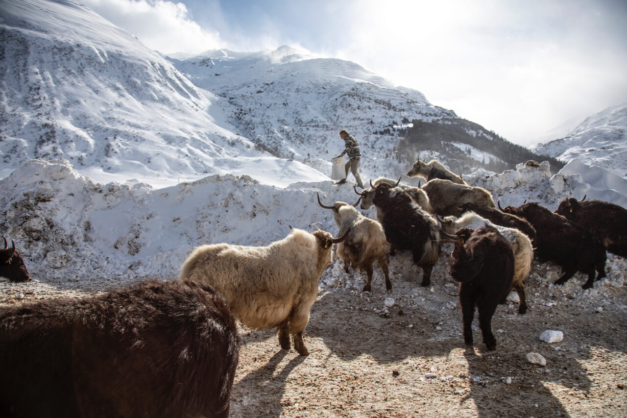 «Ich habe das Land, das fünfzig Jahre nicht mehr bewirtschaftet worden ist, von meinen Eltern übernommen,» erzählt Imboden. Nun weiden auf den braunen, schneefreien Hängen die Yaks. Sie fühlen sich im steilen Gelände sichtlich wohl. Flink springen sie an uns vorbei, als es zur Fütterung geht.