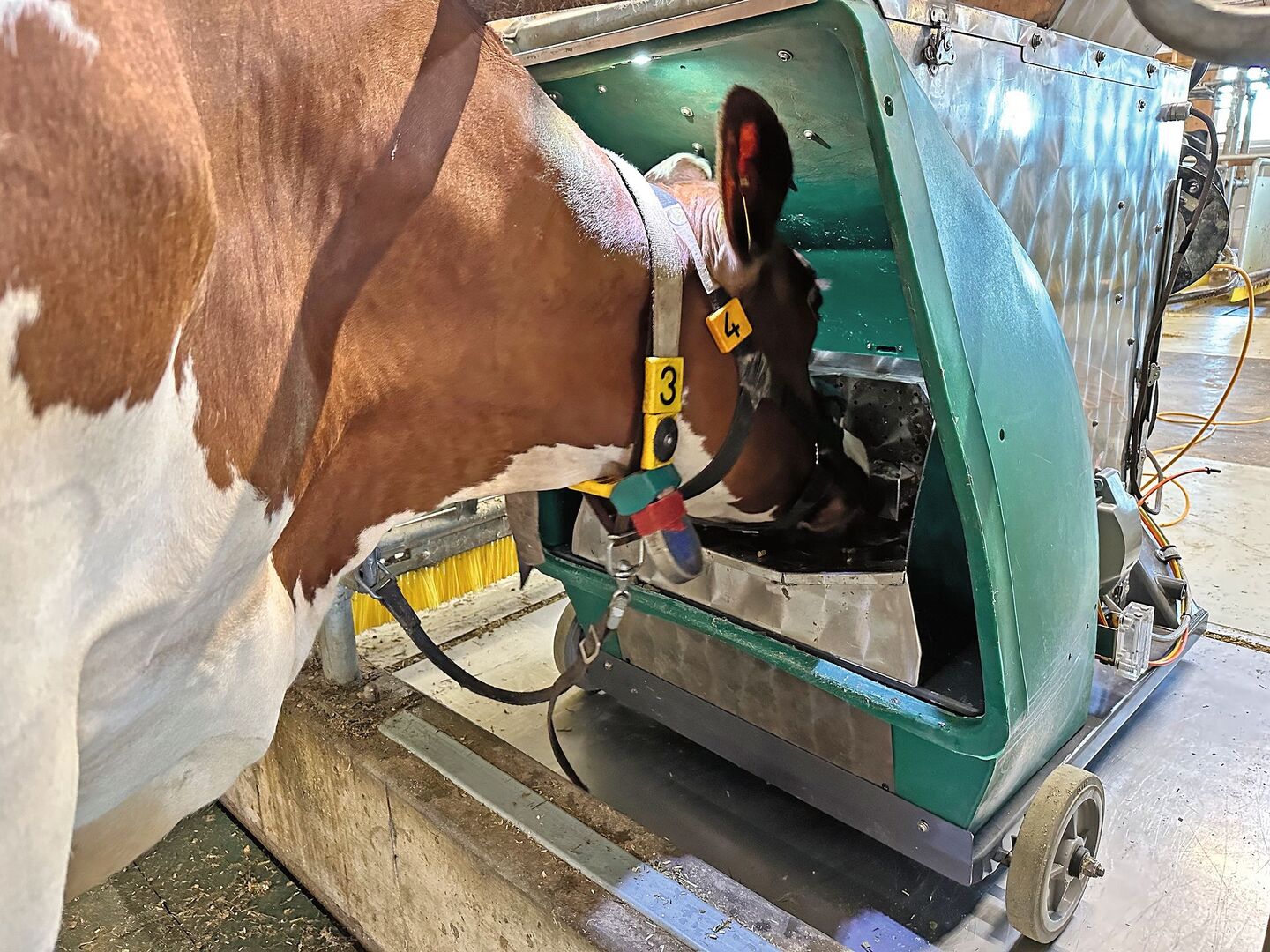 Bisher waren die Methoden zur Untersuchung des Panseninhalts entweder invasiv oder durch die Qualität der Proben begrenzt. Zusammen mit der Zenobi-Gruppe der ETH Zürich haben wir eine Methode entwickelt, die auch mit dem Tierwohl gut vereinbar ist. Dafür sammeln wir bei Kühen auf dem AgroVet-Strickhof Ausatemluftproben mit dem «GreenFeed-System». Was ähnlich wie eine Kraftfutterstation aussieht, entnimmt fast unbemerkt Proben der Ausatmenluft, ohne dass dies für das Tier eine Beeinträchtigung darstellt.
