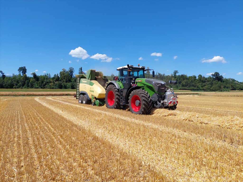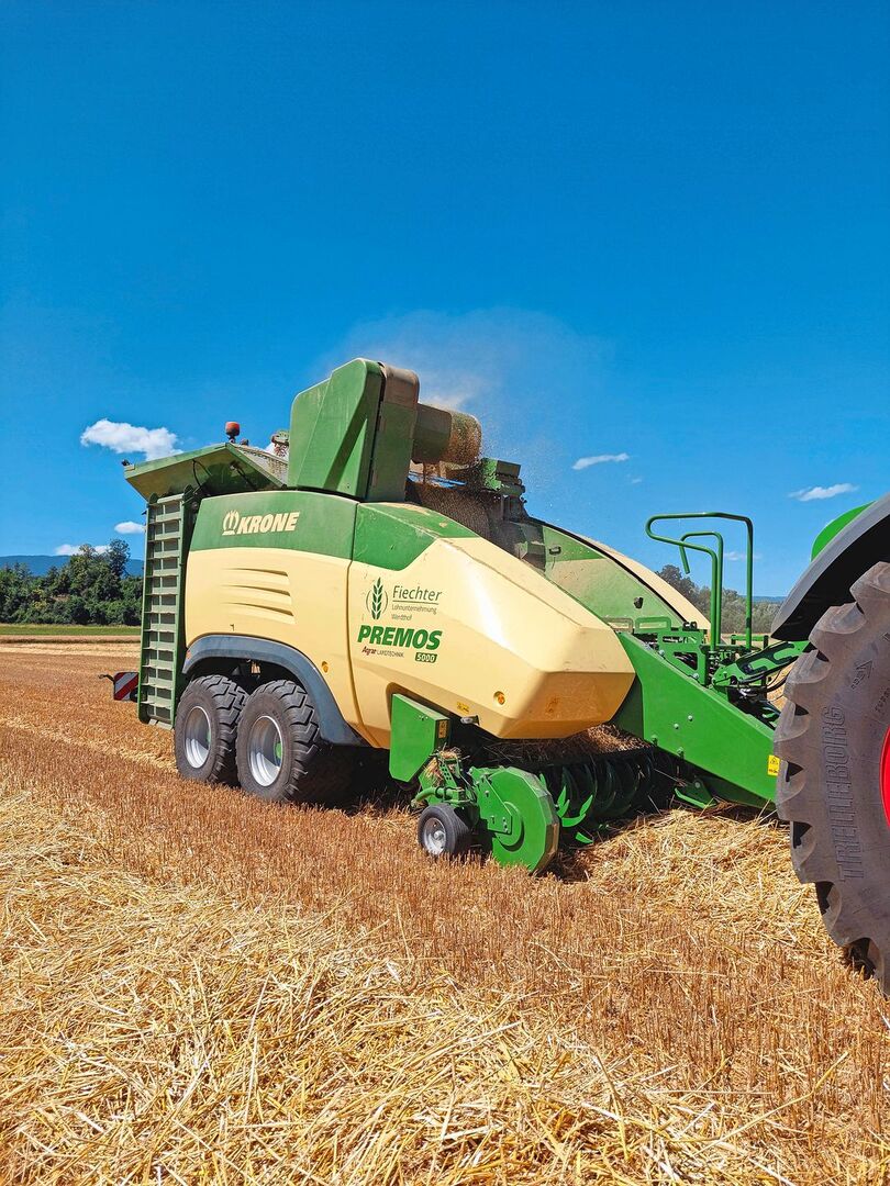 Es stäubt und brummt auf dem goldgelben Gerstenfeld bei Kappelen BE. Pascal Hess, Mitinhaber der Fiechter Lohnunternehmung, kommt mit dem Fendt 1050 angefahren, dahinter läuft die Krone-Premos-5000-Pelletpresse. Sie kann Pellets direkt ab Schwad herstellen. Dabei handelt es sich um Strukturpellets, die direkt aus Langstroh hergestellt werden.