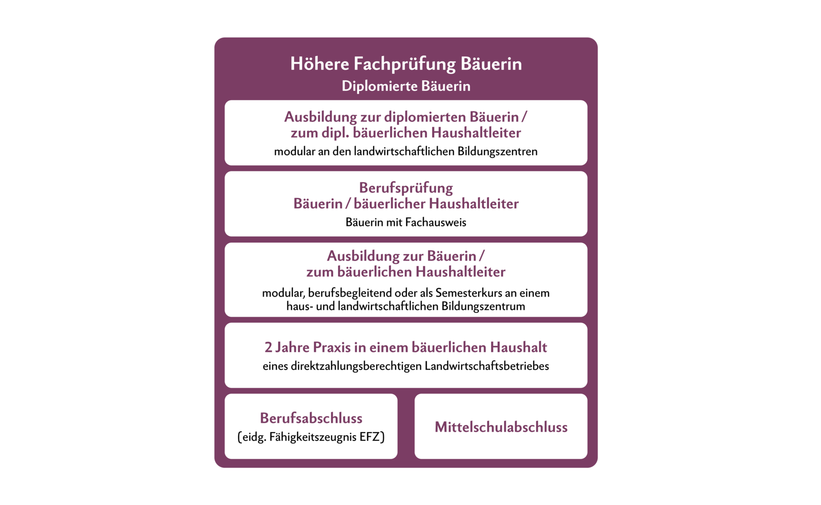 Die Diplomausbildung ist anspruchsvoll und beinhaltet Management- und unternehmerische Module, die auf den produktionstechnischen Modulen der Betriebsleiterschule aufbauen. Während der Bäuerinnenausbildung gehören zwar landwirtschaftliches Recht, Buchhaltung und Betriebslehre zu den Pflichtmodulen. Für den Einstieg in die Ausbildung der höheren Fachprüfung sind aber Module aus dem Betriebsleiterkurs Pflicht, um einen guten Übergang in die Ausbildung zur höheren Fachprüfung zu gewährleisten.