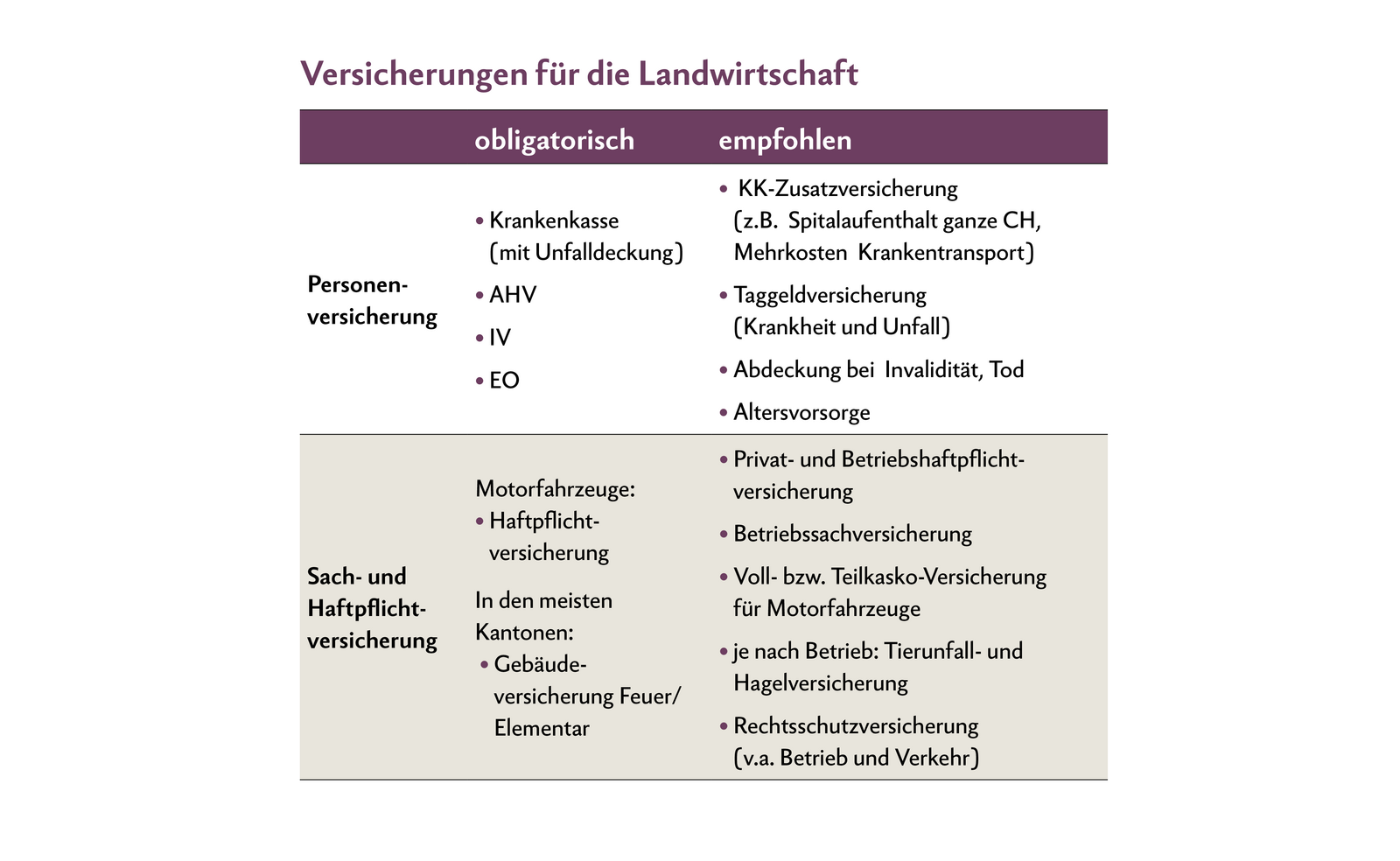 Thomas Hauri rät neben den obligatorischen Versicherungen im Bereich Personenversicherung zu einer Zusatzversicherung der Krankenkasse mit ergänzenden Leistungen zur Grundversicherung und zu einer Taggeld-Versicherung: Mit dem Geld aus der Taggeldversicherung kann, fällt der Betriebsleiter aus, eine externe Hilfskraft bezahlt werden, damit der Betrieb weiterläuft. Wichtig sei auch, je nach Familiensituation für Erwerbsunfähigkeit und den Todesfall vorzusorgen.