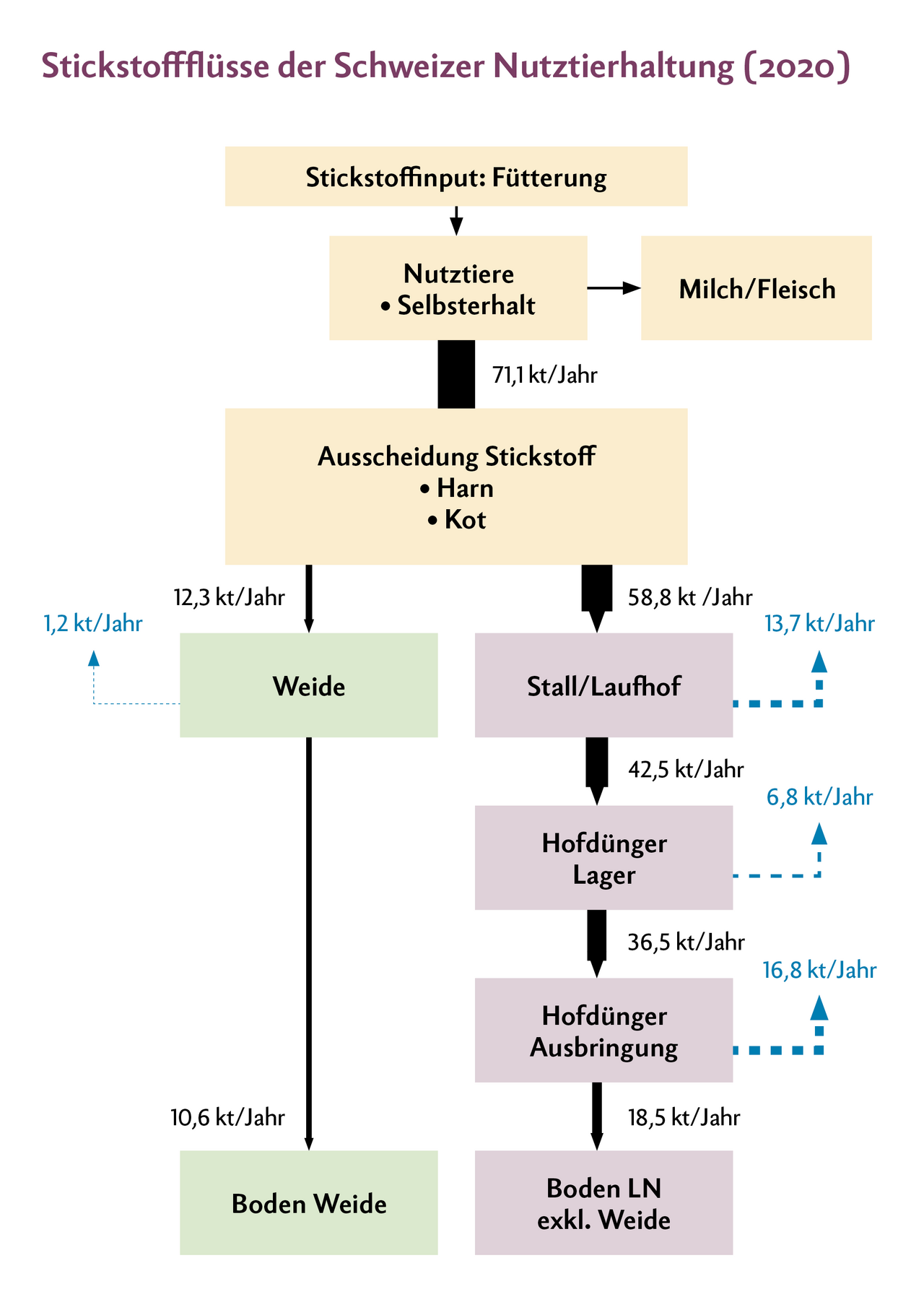 Ammoniak ist ein Gas (NH3), das Stickstoff enthält. Stickstoff ist ein Grundbaustein der Natur und ein wichtiger Nährstoff für Pflanzen und Tiere. Nutztiere nehmen Stickstoff über die Fütterung auf. Ein Teil geht in die Milch oder das Fleisch. Ein beachtlicher Teil wird aber wieder ausgeschieden. 2020 waren es 71,1 Kilotonnen löslicher Stickstoff, den Schweizer Nutztiere ausgeschieden haben (siehe Grafik).