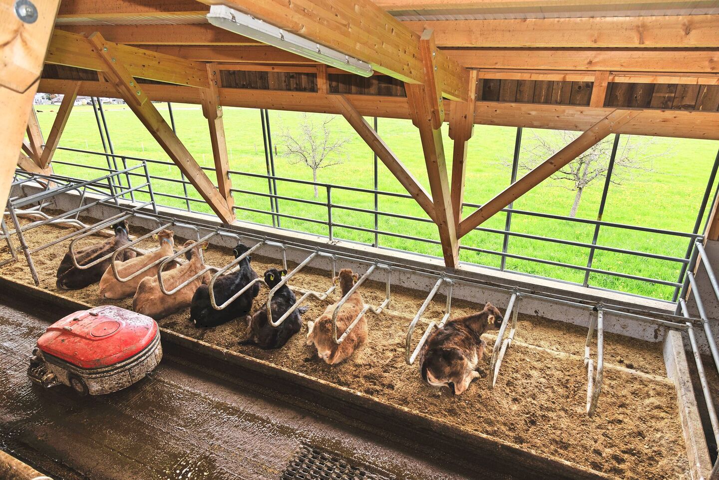 Der alte Anbindestall wurde in der Folge umgebaut und erweitert. Die Läger wurden alle herausgespitzt, sodass eine ebene Fläche entstand. So kann nun der Entmistungsroboter von Lely ungehindert die Flächen putzen. Im alten Stall wird den Mastrindern das Futter vorgelegt und Wasser angeboten. Der ehemalige Laufhof wird nach wie vor als solcher genutzt.
