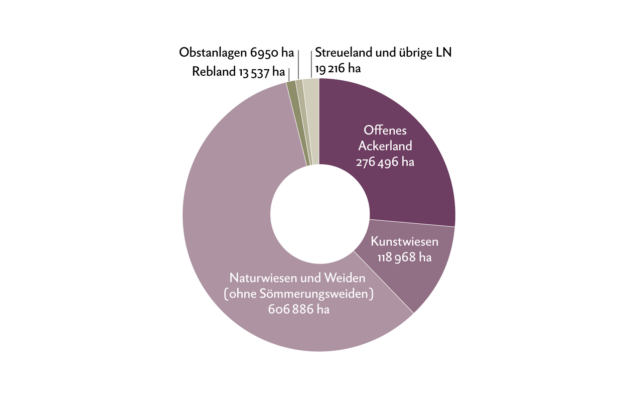 Davon sind – ohne Sömmerungsflächen – 1'452'500 ha Landwirtschaftsfläche. Alpwirtschaftsflächen machen zusätzliche 503'300 ha aus.