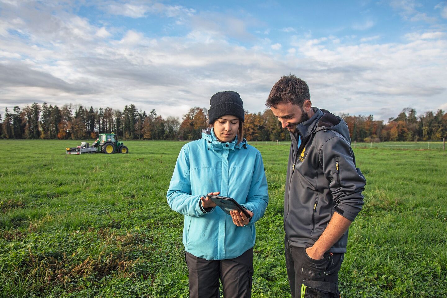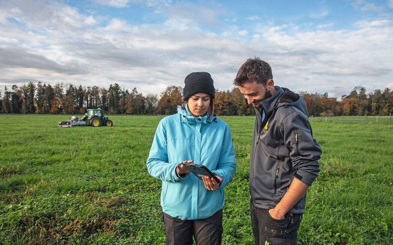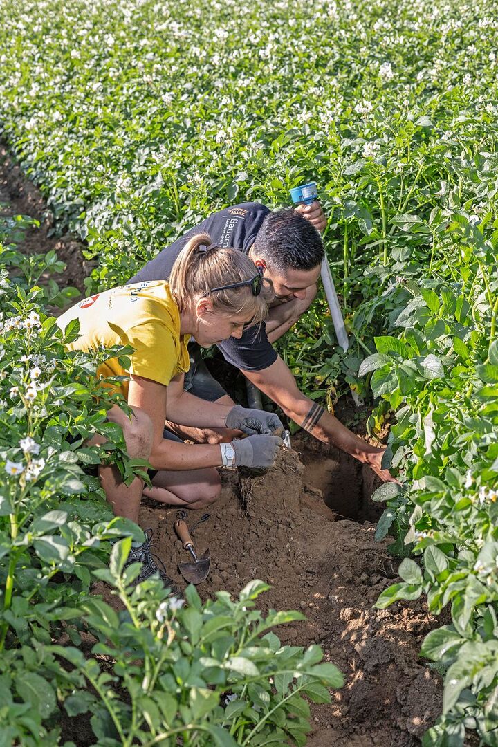 Genügend Wasser für gesunde Kartoffeln: Andrea Marti von der HAFL und Landwirt David Perler aus Kleinguschelmuth FR, untersuchen, wie sich die Kartoffeln entwickeln.