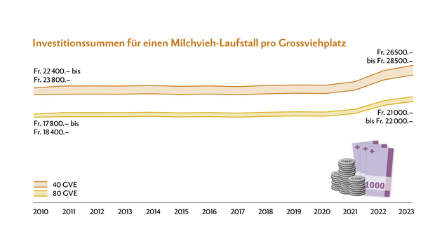 Wie viel kostet der Bau eines Stalls? Die Antwort darauf ist nicht ganz einfach, da es auf das jeweilige Bauprojekt ankommt. Richtwerte liefert die Modellrechnung von Agroscope. In unserer Infografik zeigen wir die Entwicklung der Investitionssummen für den Bau eines Milchvieh-Laufstalls.