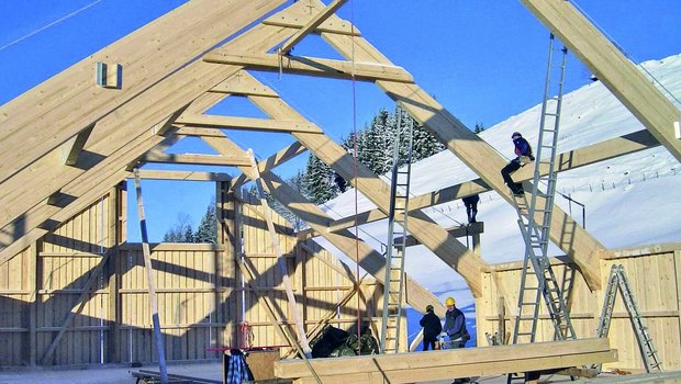 Familie Aerne hat den Milchviehstall ausgebaut. Dabei haben sie sehr viel Eigenleistung investiert. Als Baumaterial setzten sie Holz aus dem eigenen Wald ein. Die Bäume hatten sie zuvor selbst gefällt.