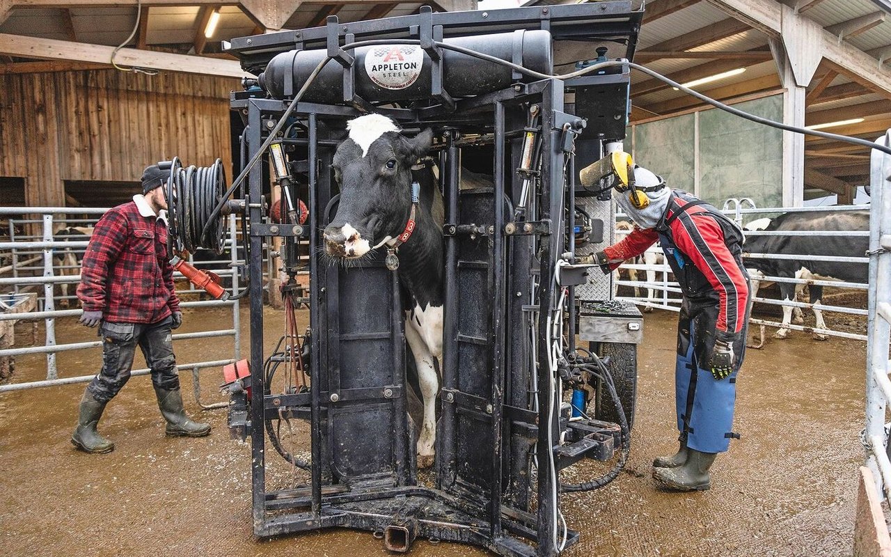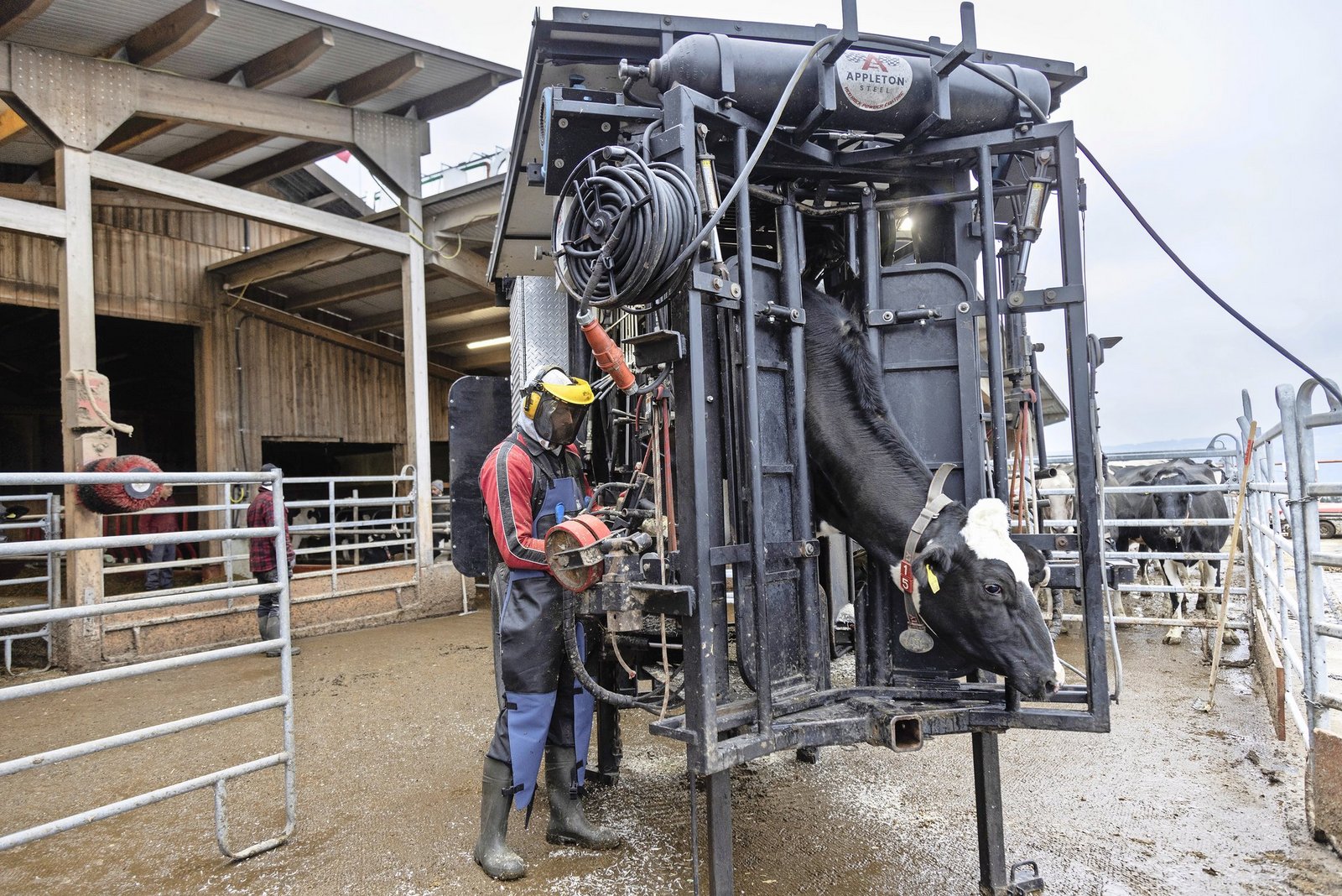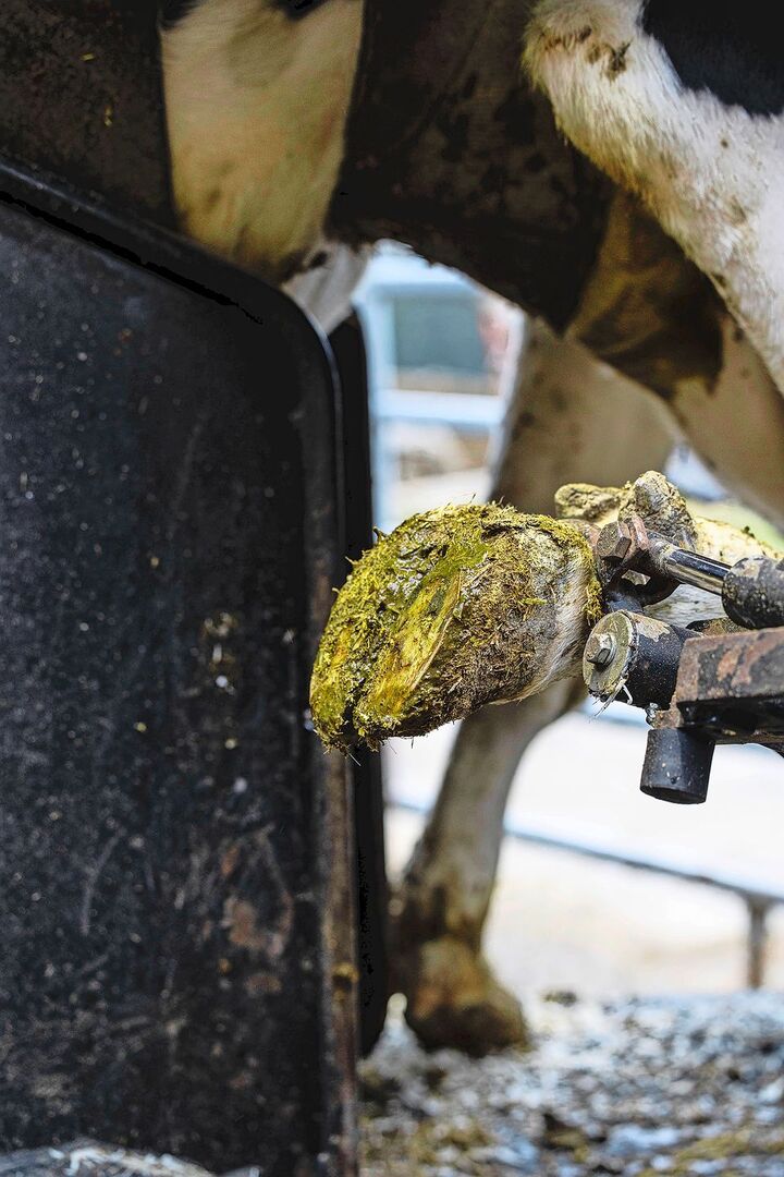 Sobald die Pflege an allen Klauen durchgeführt wurde, wird der Klauenstand wieder gesenkt und die Kuh kann zurück in den Stall.