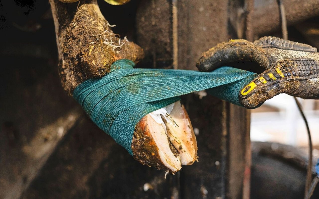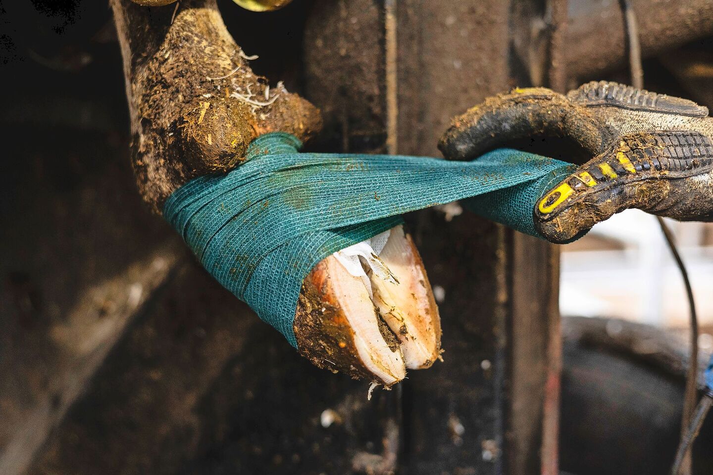 Aufgrund einer Mortellaro-Läsion bringt Suter einer Kuh einen Verband an, um die Salbe zu fixieren.