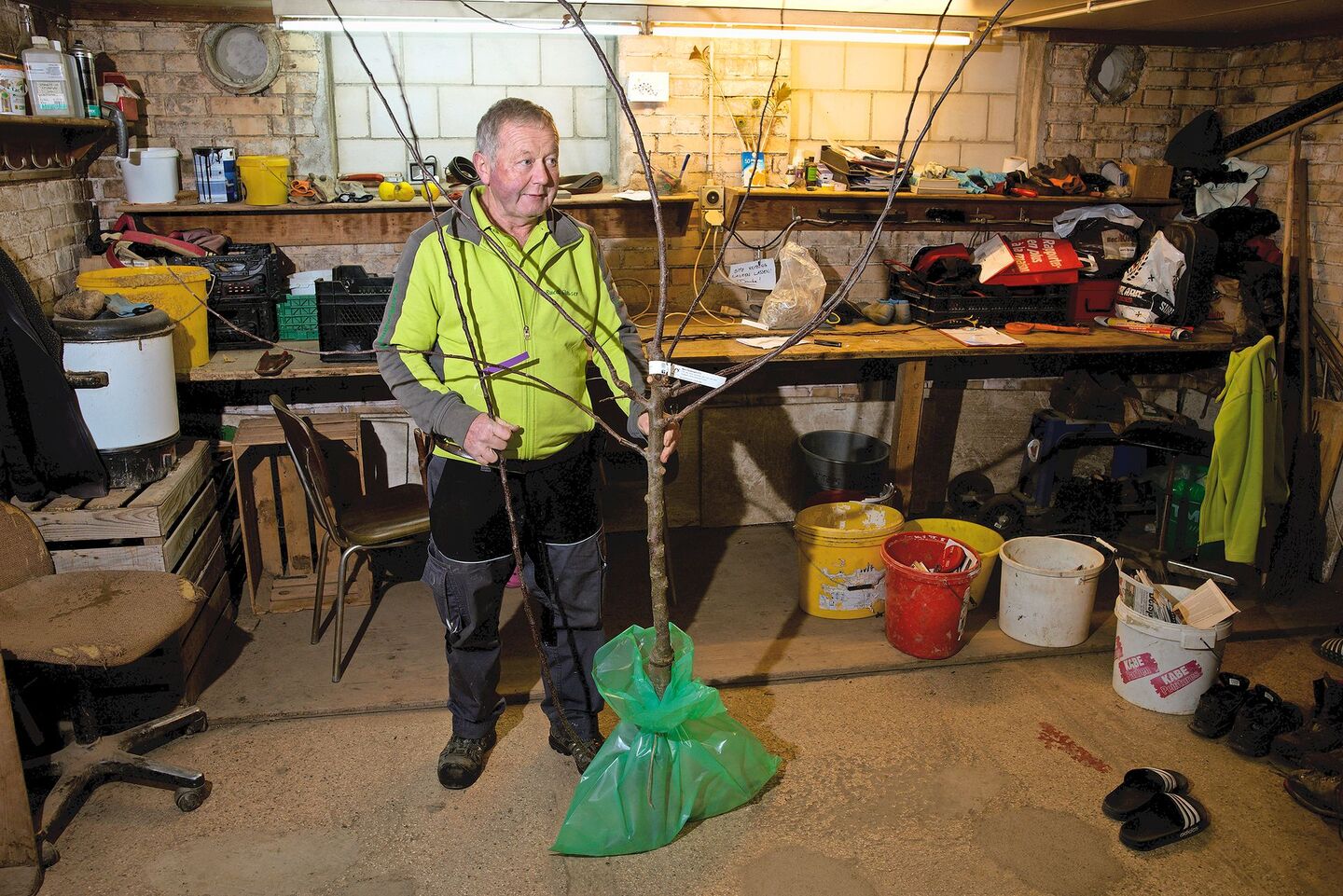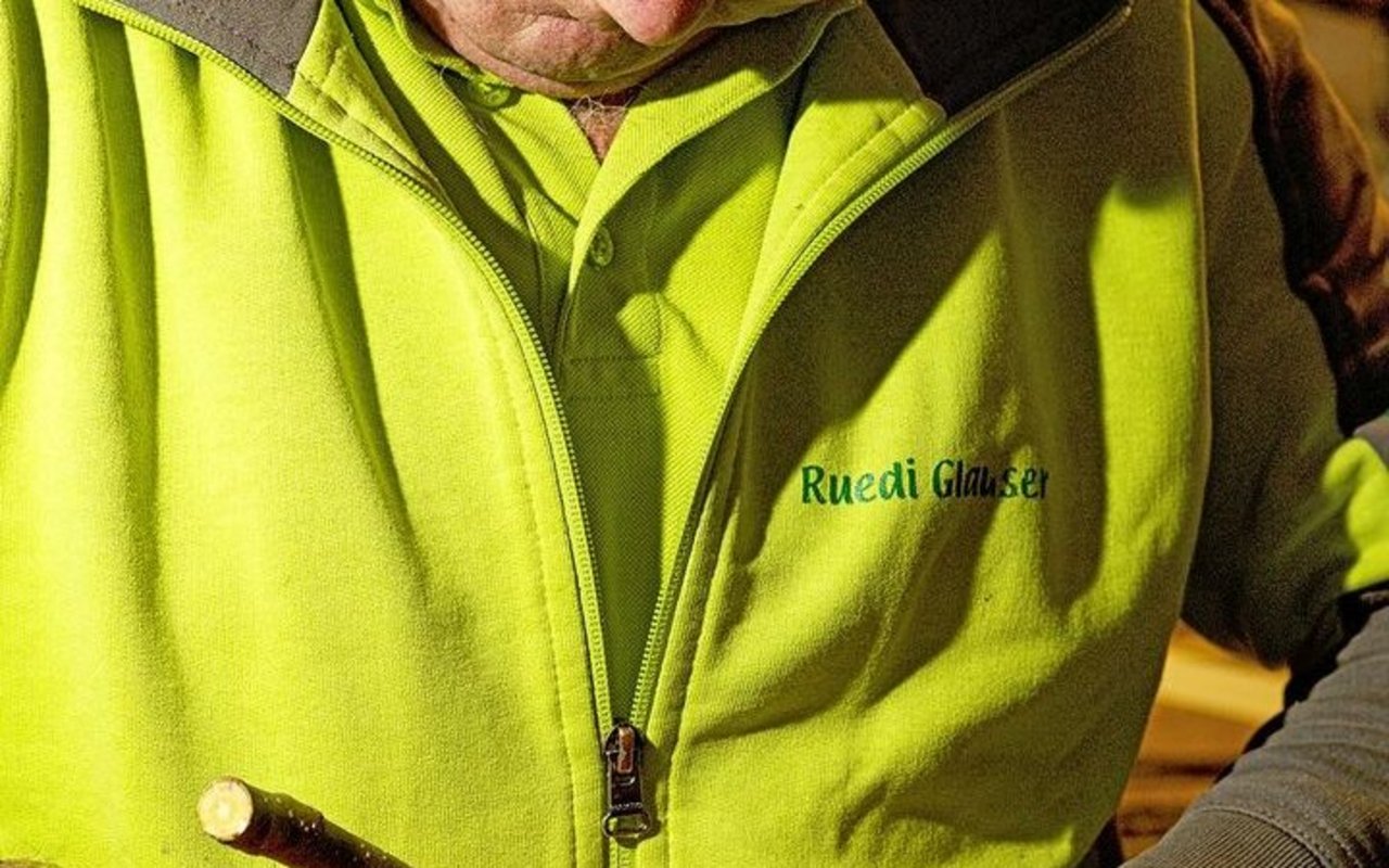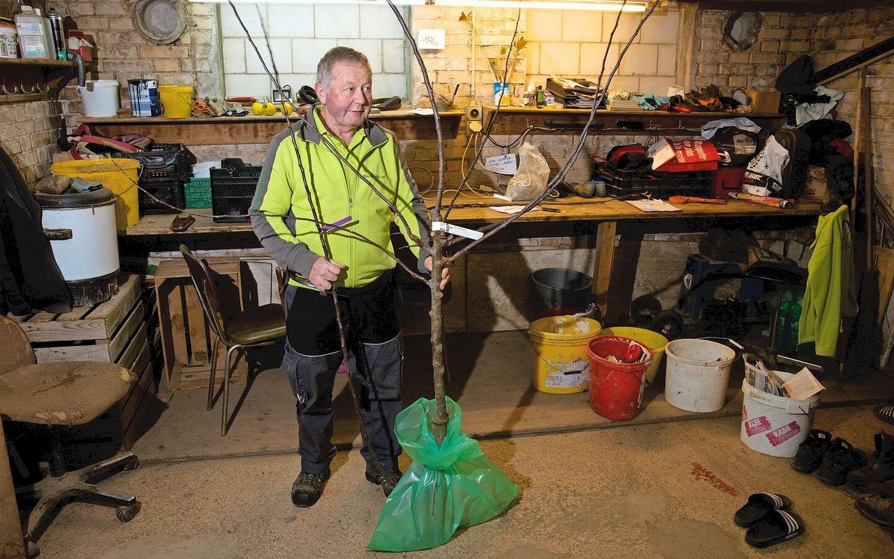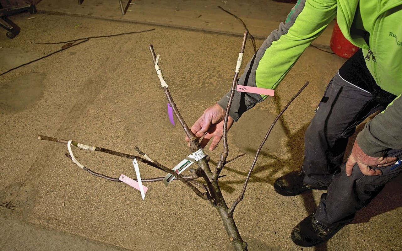 Der Baumschulist Ruedi Glauser veredelt auf einen Paradiesapfel-Stamm vier Sorten. Er hat robuste, resistente Sorten ausgewählt: eine frühe Sorte (Julia), eine Sommersorte (Sommerglück) und zwei Lageräpfel (Opal und Topaz).