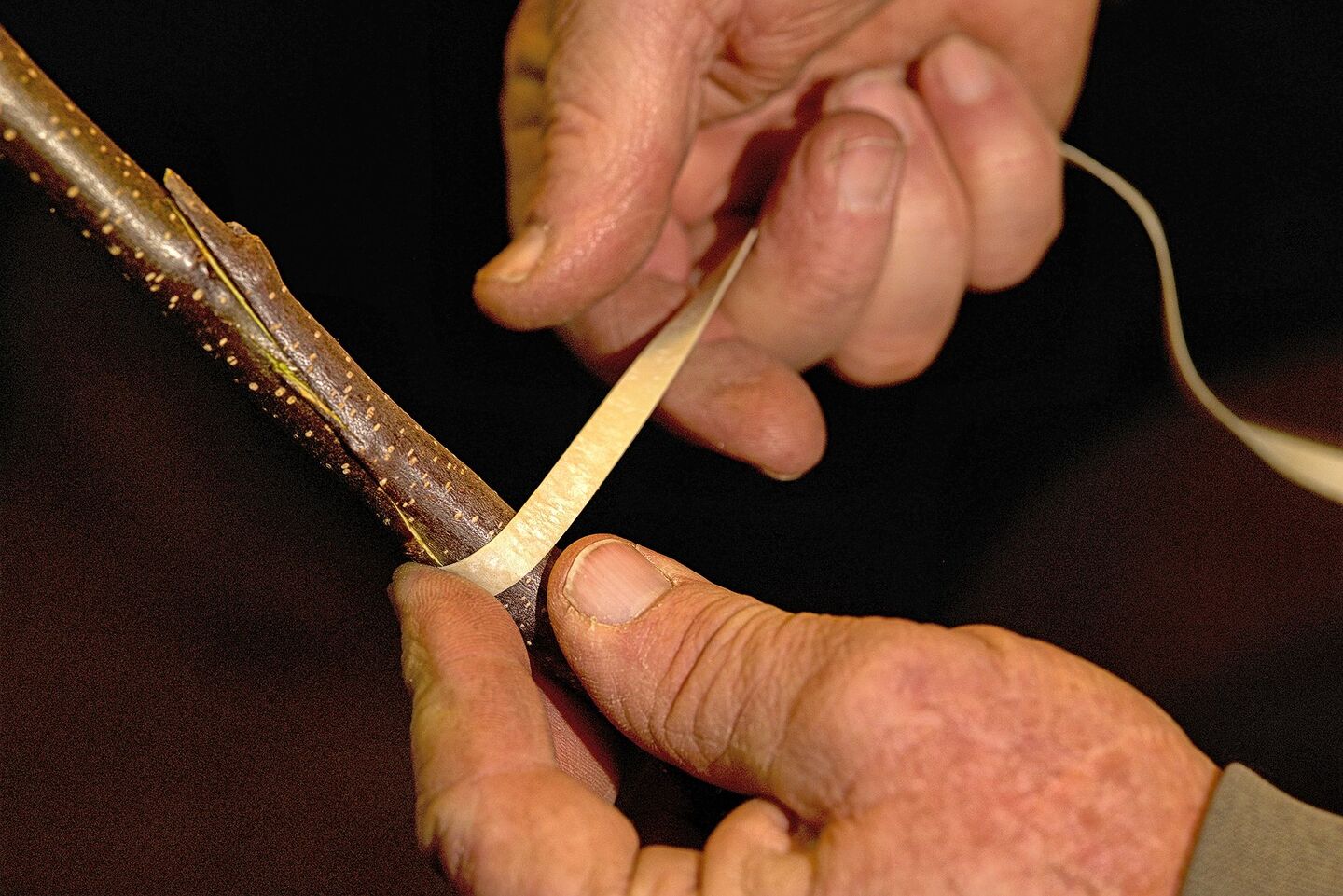 Sorgfältig fügt Glauser die Zungen von Edelreis und Unterlage zusammen. Die Gegenzungen vergrössern die Flächen und geben Halt.