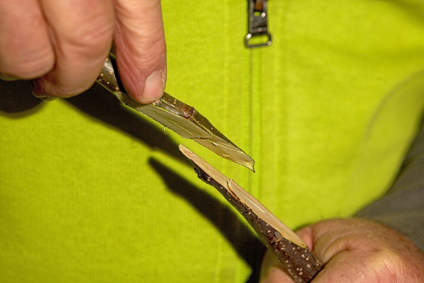 Das Kambium ist entscheidend, damit die beiden Stücke gut zusammenwachsen. Deshalb liegt Kambium auf Kambium.