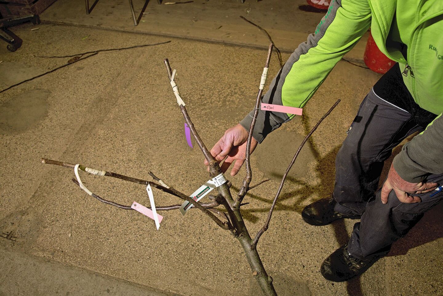 Der Baum kommt nun in einen Topf und kann ab Juli/August zu den Kunden. Er kann ab Herbst gepflanzt werden. Die verschiedenen Farben zeigen, auf welchen Ast welche Sorte veredelt wurde.