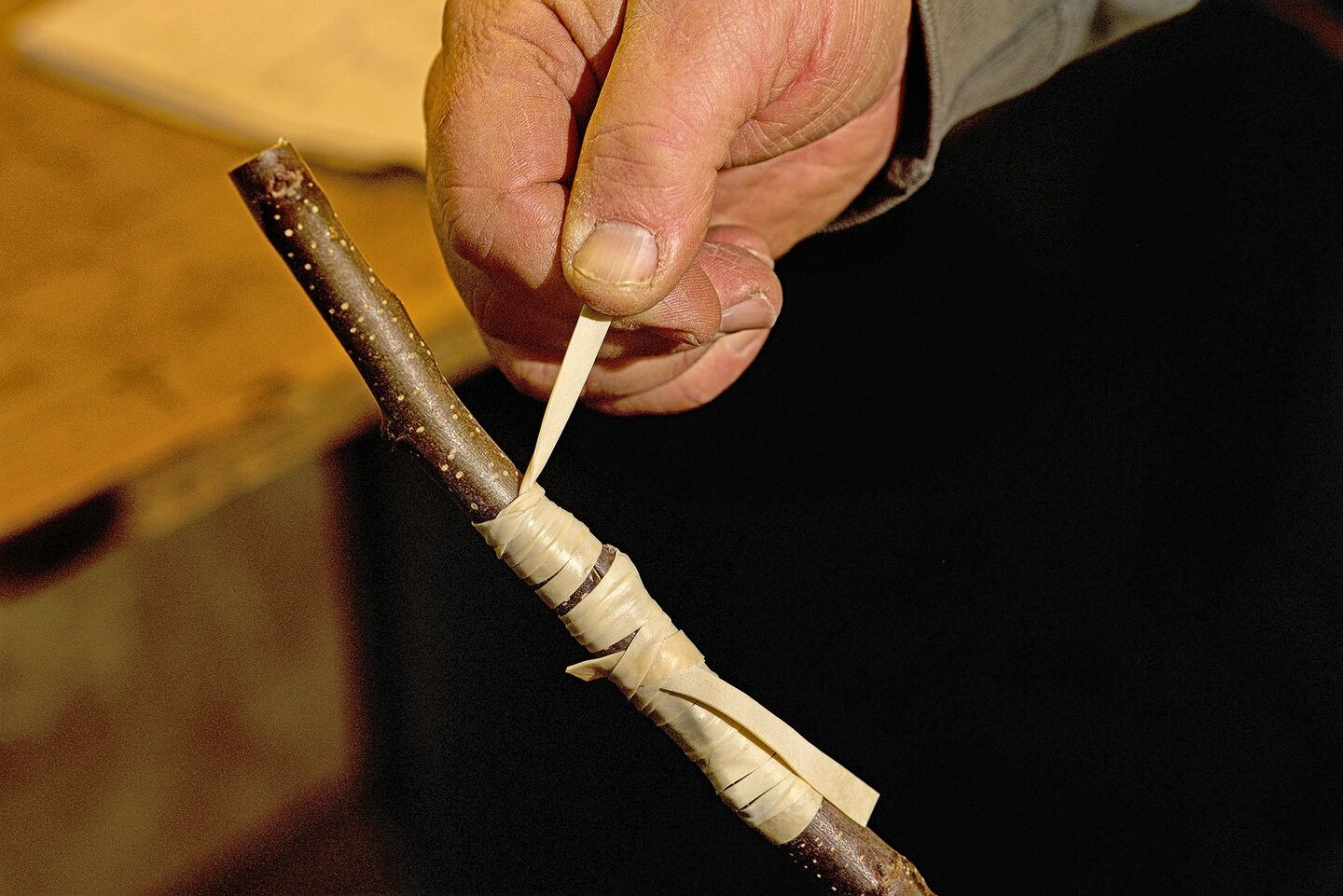 Mit einem Gummiband verbindet Glauser die beiden Stücke und presst so Edelreis und Unterlage zusammen.