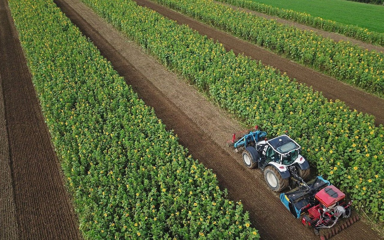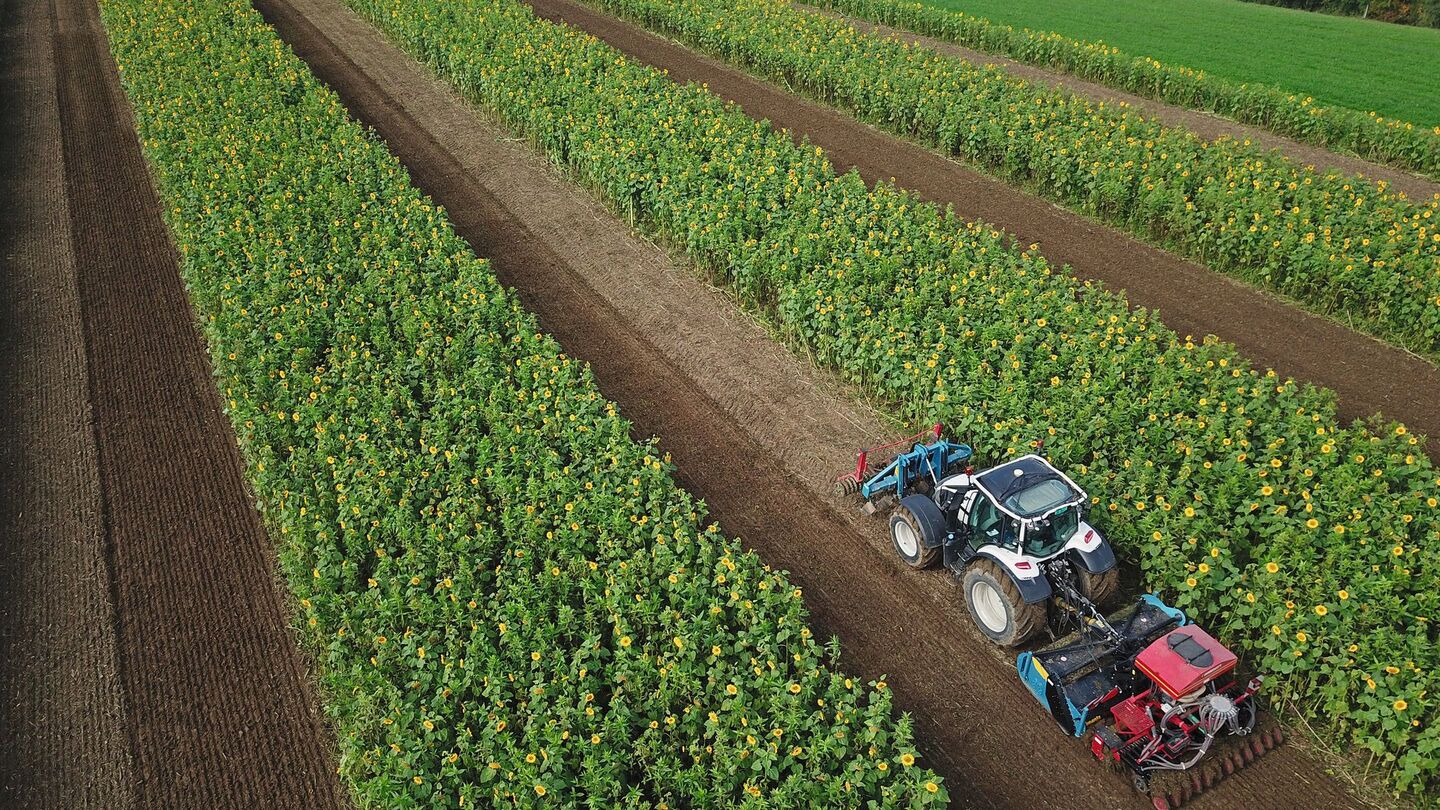 Am 5. und 10. Oktober wurde in den gemulchten Streifen in den Sonnenblumen Gras gesät.