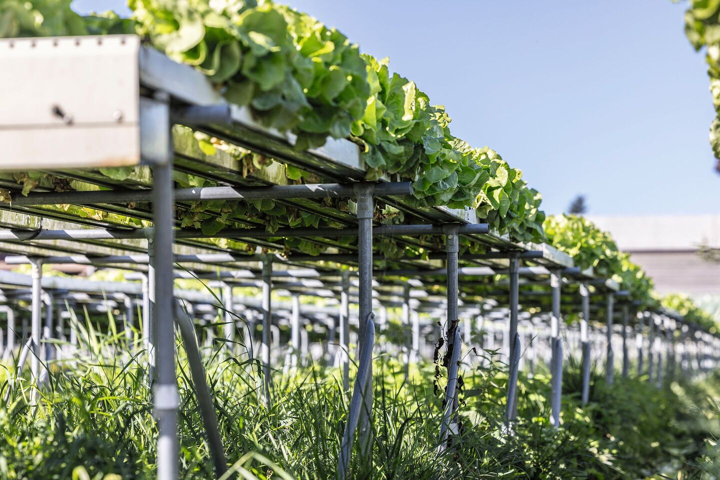 An neuen Ideen zeigt sich Wyssa stets interessiert. Er ist der einzige Produzent in der Schweiz, der Hydrosalate im Freien anbaut. Nachdem er sich auf einer Exkursion einer deutschen Samenfirma Hydro-Produktionsanlagen in Belgien und den Niederlanden angeschaut hatte, war für ihn klar: «Das ist die Zukunft der Salatproduktion.» Seit 2016 wachsen auf 4500 m2 Salate und seit diesem Jahr auch Pak Choi quasi auf Stelzen. Schmale weisse Metallrinnen mit viereckigen Aussparungen stehen auf einem Metallgestänge, im Boden sind die Wasser-leitungen kaum mehr sichtbar. Sie versorgen die Pflanzen mit Wasser, das mit Nährstoffen angereichert ist.
