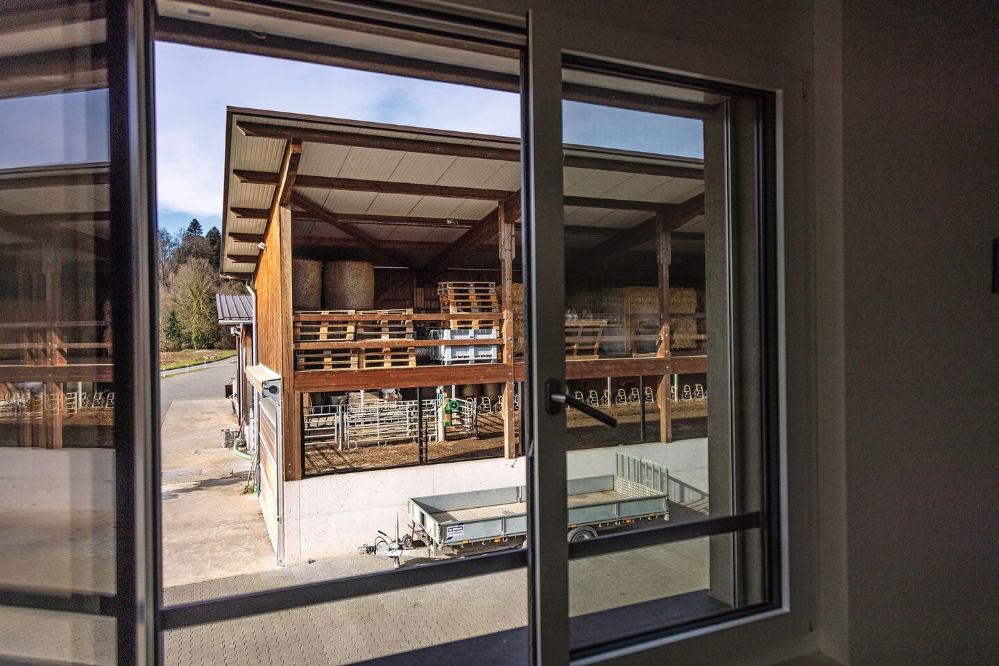 Die Kühe gaben den Ausschlag für die komplette Aussiedlung 2017: Kohler haben ein Zweifamilienhaus gebaut, gleich daneben steht der offene Stall für die Mutterkühe, ihre Kälber und den Stier. Die Simmentaler sind während der Weidesaison im Wechsel mit den Legehennen auf der Weide: Am Morgen sind die Kühe auf der mit Hochstamm-Obstbäumen bepflanzten Weide, am Nachmittag dann die Hennen. [IMG 9]