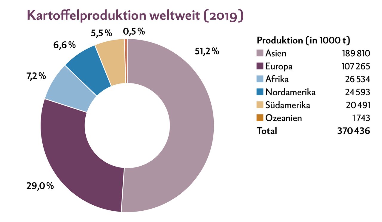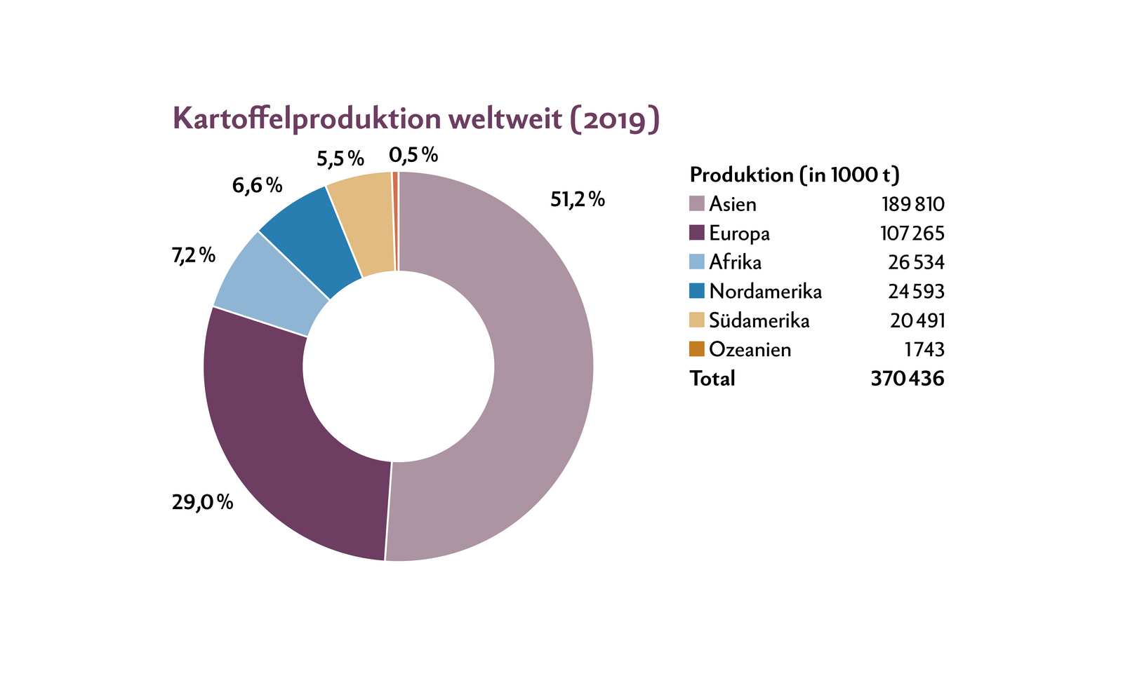 Asien produzierte 2019 mehr als 50 Prozent der weltweiten Kartoffelproduktion. An zweiter Stelle folgt Europa. Die restlichen Weltregionen kommen zusammengerechnet auf einen Fünftel der Gesamtproduktion.