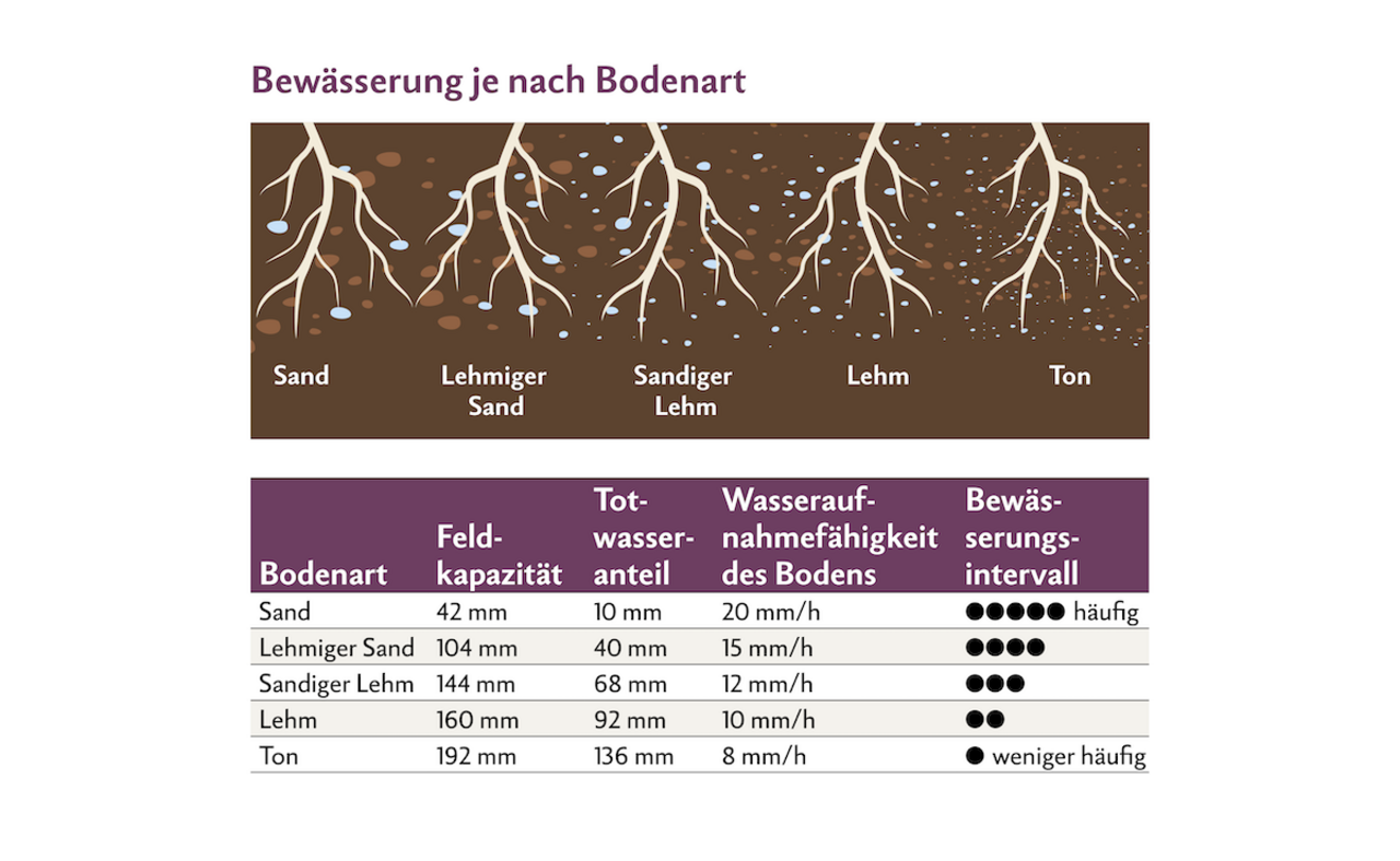 Ton-haltige Böden brauchen länger für eine Wassergabe, weil ihre Aufnahmefähigkeit gering ist. Sie können dank grösserer Feldkapazität mehr Wasser speichern und müssen seltener bewässert werden als leichte Böden.