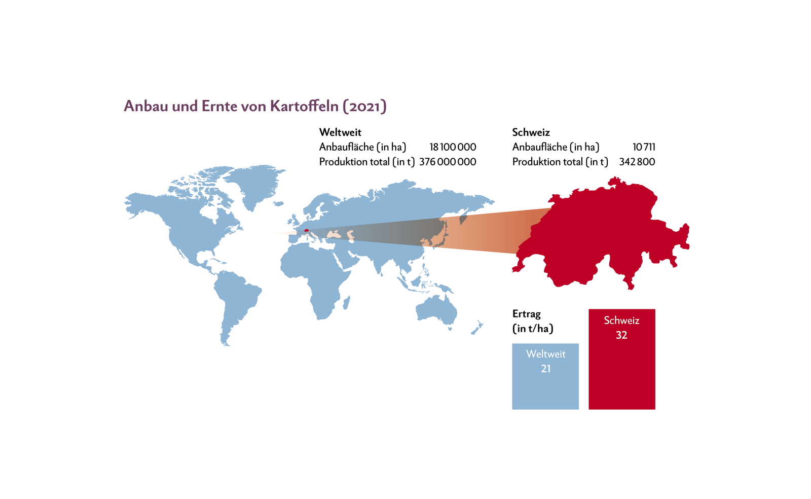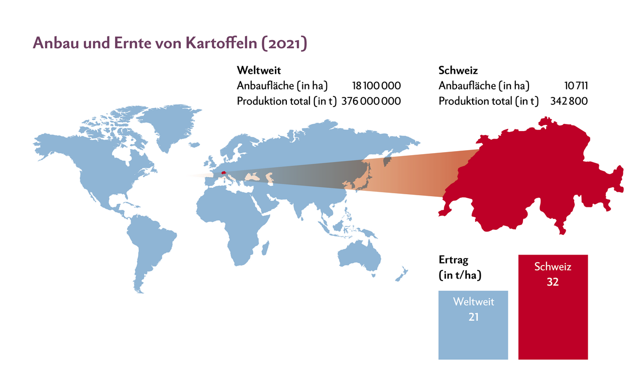 Weltweit wird auf gut 18 Millionen ha Kartoffeln angebaut. Das ist eine Fläche, die 4,5 mal so gross ist wie die Schweiz. Bei uns ist die Produktivität übrigens grösser: 2021 produzierten wir 32 t/ha, während weltweit 21 t/ha geerntet wurden. 2022 wurde der Kartoffel-Ertrag auf 36 t/ha gesteigert, meldet Swisspatat.