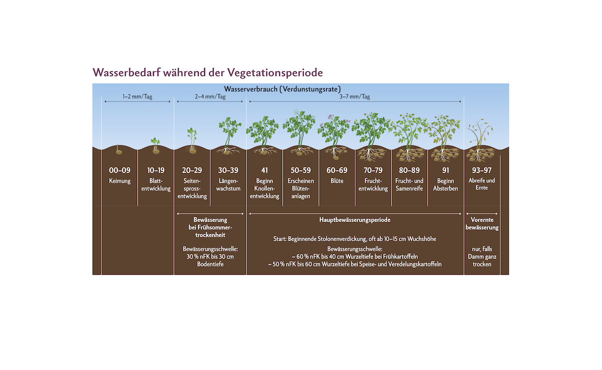 Während der Knollenbildung brauchen Kartoffeln eine konstante Wasserversorgung – sonst kann es zu Hohlherzigkeit, Keimen oder Kindeln kommen. Die Hauptbewässerungsperiode beginnt im BBCH-Stadium 41, mit der Knollenbildung. Bei einer nFK (siehe Glossar) unter 50 % sollten Speise- und Veredelungskartoffeln bewässert werden.