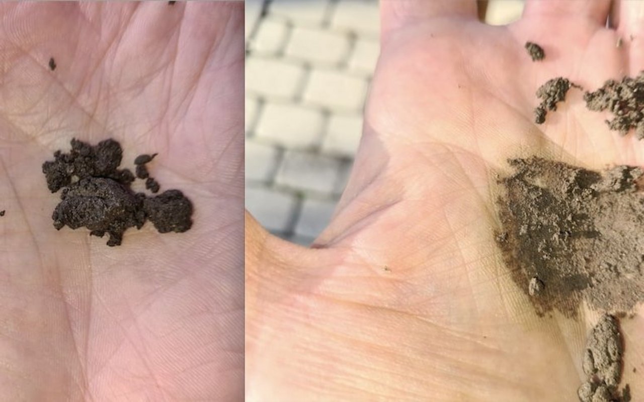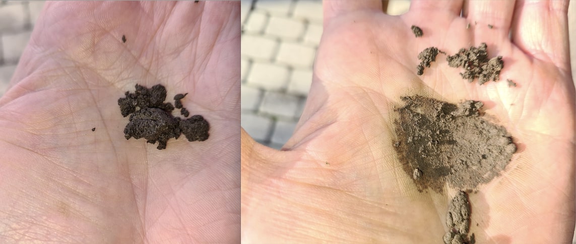 Ob der Boden über stabile Krümel verfügt, lässt sich leicht testen. Man verreibt einige Krümel mit dem Finger auf der Hand. Wird die Farbe mit der Zeit heller, sind die Krümel aufgebrochen und die helleren mineralischen Bodenbestandteile kommen an die Oberfläche. Trifft dies ein, verfügt der Boden über Krümel.
