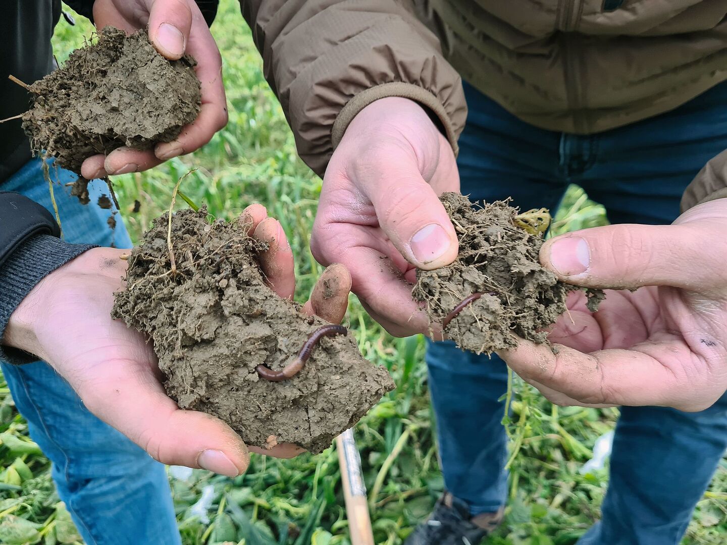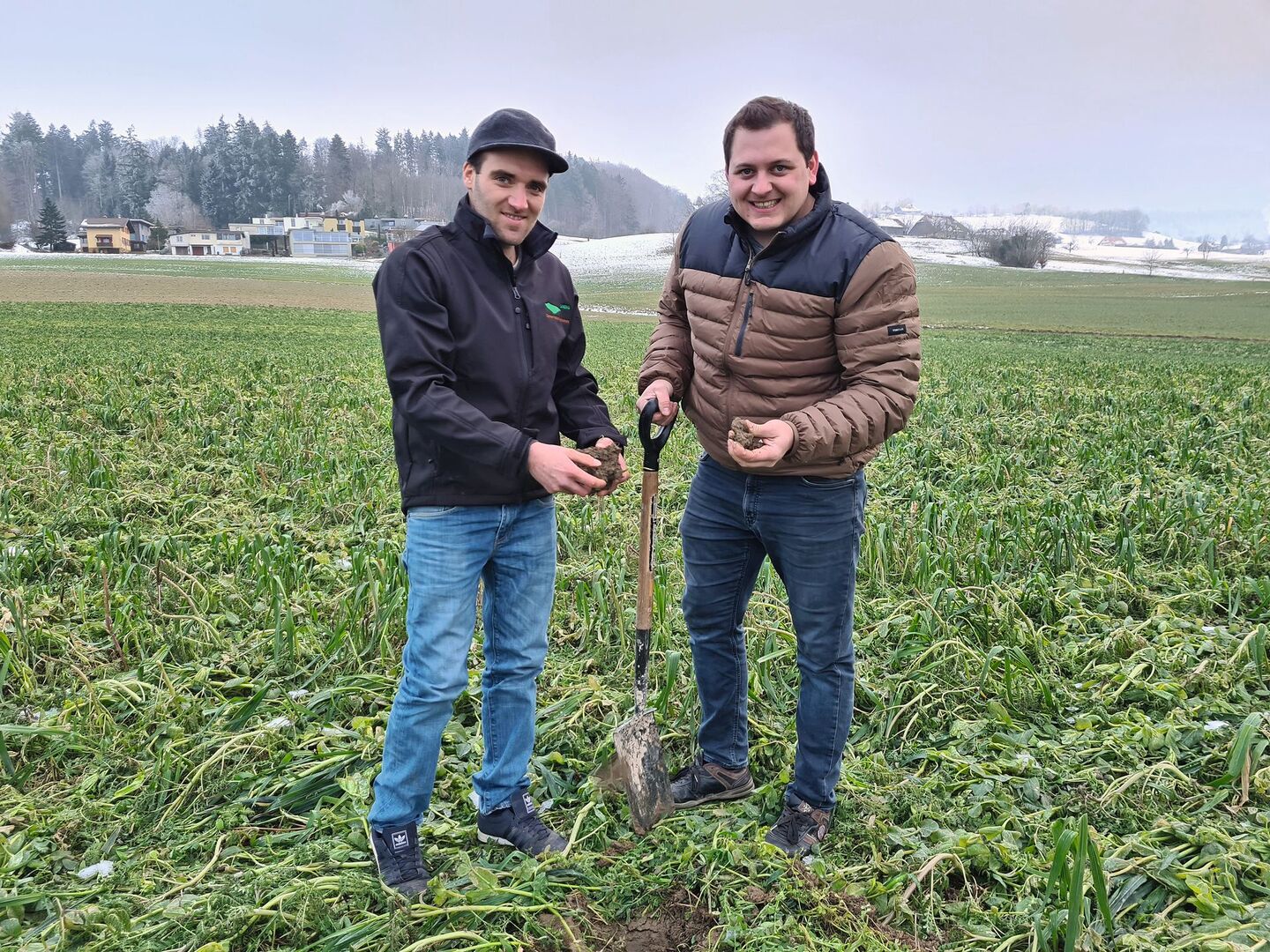 Auf dem Gründüngungsfeld, auf dem die beiden Landwirte mit dem Spaten unterwegs sind, wird klar, dass man sie tausend Mal fragen könnte, ob sie sich vorstellen könnten, doch einmal ein Feld zu pflügen. Sie würden sicher Nein sagen. Man glaubt ihnen, dass sie nicht im Traum daran denken, den schönen Bodenaufbau über den Haufen zu werfen.