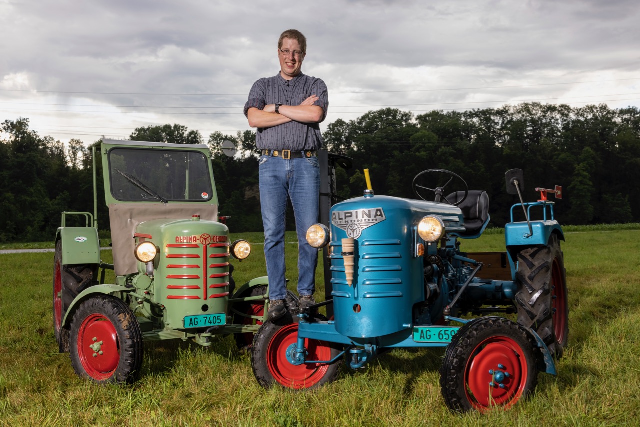 Dominik Laube (26), Lokführer/Feuerwehrmann bei der SBB aus Lengnau AG: «Landwirtschaft ist eines meiner vielen Hobbies. Ich setze die Traktoren hauptsächlich für leichte Arbeiten wie Holz- und Tiertransporte ein, mache mit ihnen Ausfahrten oder gehe an ein Oldtimertreffen. Der blaue Alpina Oekonom LD1 der erste eigene Traktor, den ich mit einem Kollegen restauriert habe.