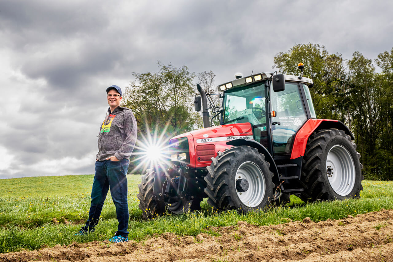 «Mein Massey Ferguson 6270 ist ein echter Dampfhammer, weil die Motorleistung von 115 auf 130 PS erhöht wurde» erklärt Lohnunternehmer Steve Zurkinden aus Tentlingen FR. Die 17 Dienstjahre und 4700 Stunden sieht man dem Traktor mit Baujahr 2002 nicht an, weil Zurkinden den Traktor nach jedem Einsatz sorgfältig wartet und pflegt.