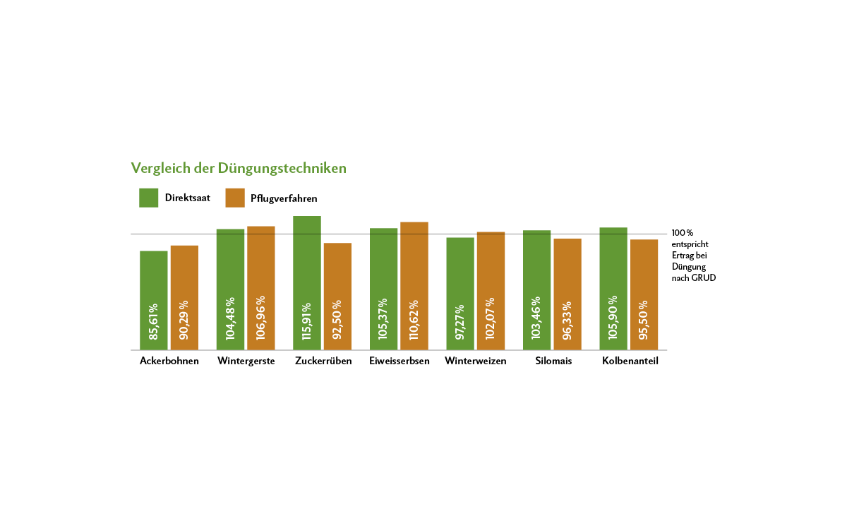 Nach knapp zwölf Jahren Gegenüberstellung Kinsey – GRUD lassen sich erste Schlüsse ziehen. Projektkoordinator Andreas Chervet von der Fachstelle Boden des Kantons Bern hat beobachtet, dass mit Ausnahme bei der Kultur «Ackerbohne» die Düngung nach Kinsey zu leicht höheren Erträgen führt. «Die Bodenbearbeitung ist jedoch ertragswirksamer als die Düngung», sagt Chervet, «am höchsten sind die Erträge beim Verfahren Direktsaat kombiniert mit Kinsey.»