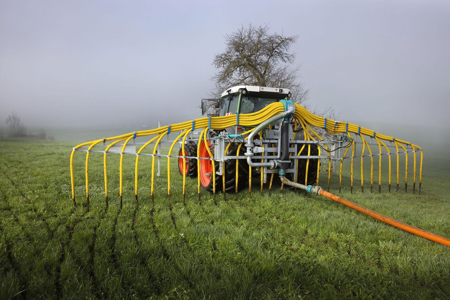 Besonders mit dem Schleppfix hat Ammann gute Erfahrungen gemacht. Dieser funktioniert ähnlich wie ein Schleppschuh und legt die Gülle präzise und bodennahe ab. Das vermindert sowohl die Futterverschmutzung als auch die Ammoniakemissionen gegenüber dem Schleppschlauch. «Dicke Gülle war kein Problem», erzählt Ammann. Bei ganz dicker Gülle musste er jedoch die Gülleabweiser ganz öffnen, so dass die Gülle fast aussah wie breitverteilt.