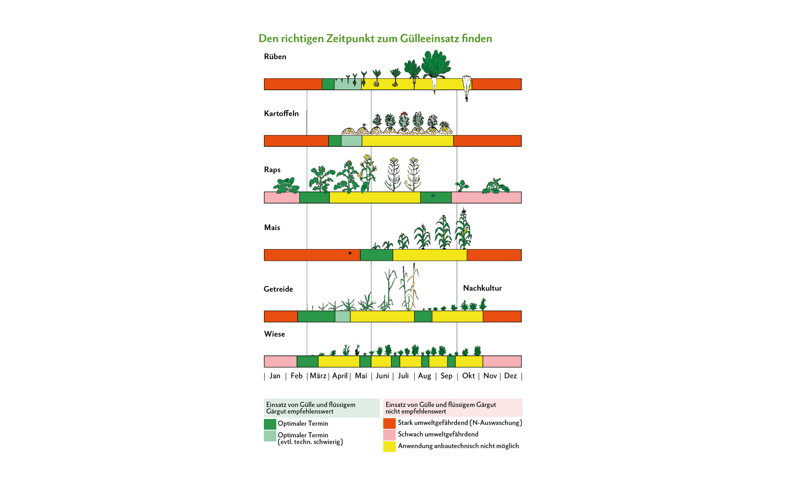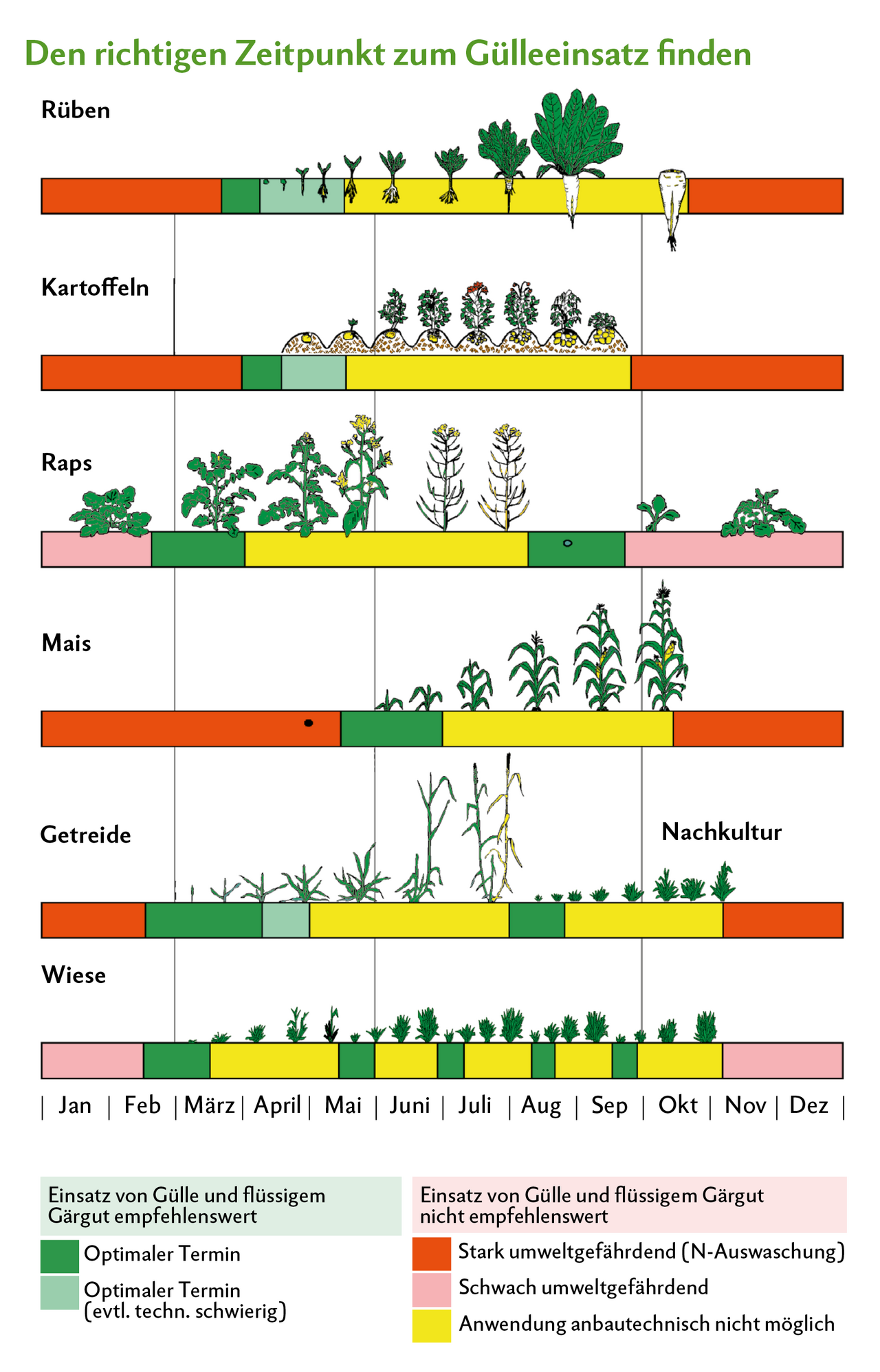 Im Frühling hingegen macht es Sinn, kurz nach der Vegetationsruhe mit Andüngen zu beginnen. Zum Andüngen von Getreide und Raps empfiehlt Vollenweider als erste Gabe Kunstdünger anzuwenden und erst später mit Gülle reinzufahren. Die Gülle braucht eine gewisse Bodentemperatur, damit der Stickstoff umgesetzt werden kann. Zudem sind im März die Ackerfelder oftmals zu nass, um mit den schweren Traktoren mit Schleppschlauchverteiler befahren zu werden.