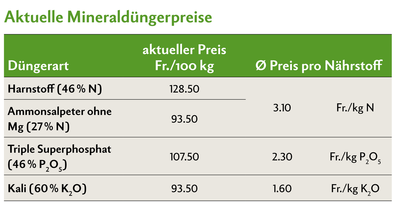 Deshalb empfiehlt Othmar Vollenweider eine mineralische Ergänzung. So hat man die Möglichkeit, den Stickstoffbedarf der Pflanze gezielt zu decken, da man beim Mineraldünger genaue Kenntnisse zu den Gehalten und der Wirkung hat. Ausserdem leidet der Ertrag und die Qualität der Kultur bei Stickstoffmangel. Gerade beim Weizen können dann Proteingehalte tiefer ausfallen oder beim Mais leidet der Ertrag an Trockensubstanz pro Hektare. «Ertragsverluste und Qualitätsmängel beim Silomais ziehen sich dann durch die ganze Mast. Wenn ich bei den Mastmunis schlechtere Zunahmen habe, verliere ich mehr, als wenn ich etwas Geld für Mineraldünger ausgebe», meint Christian Glur.