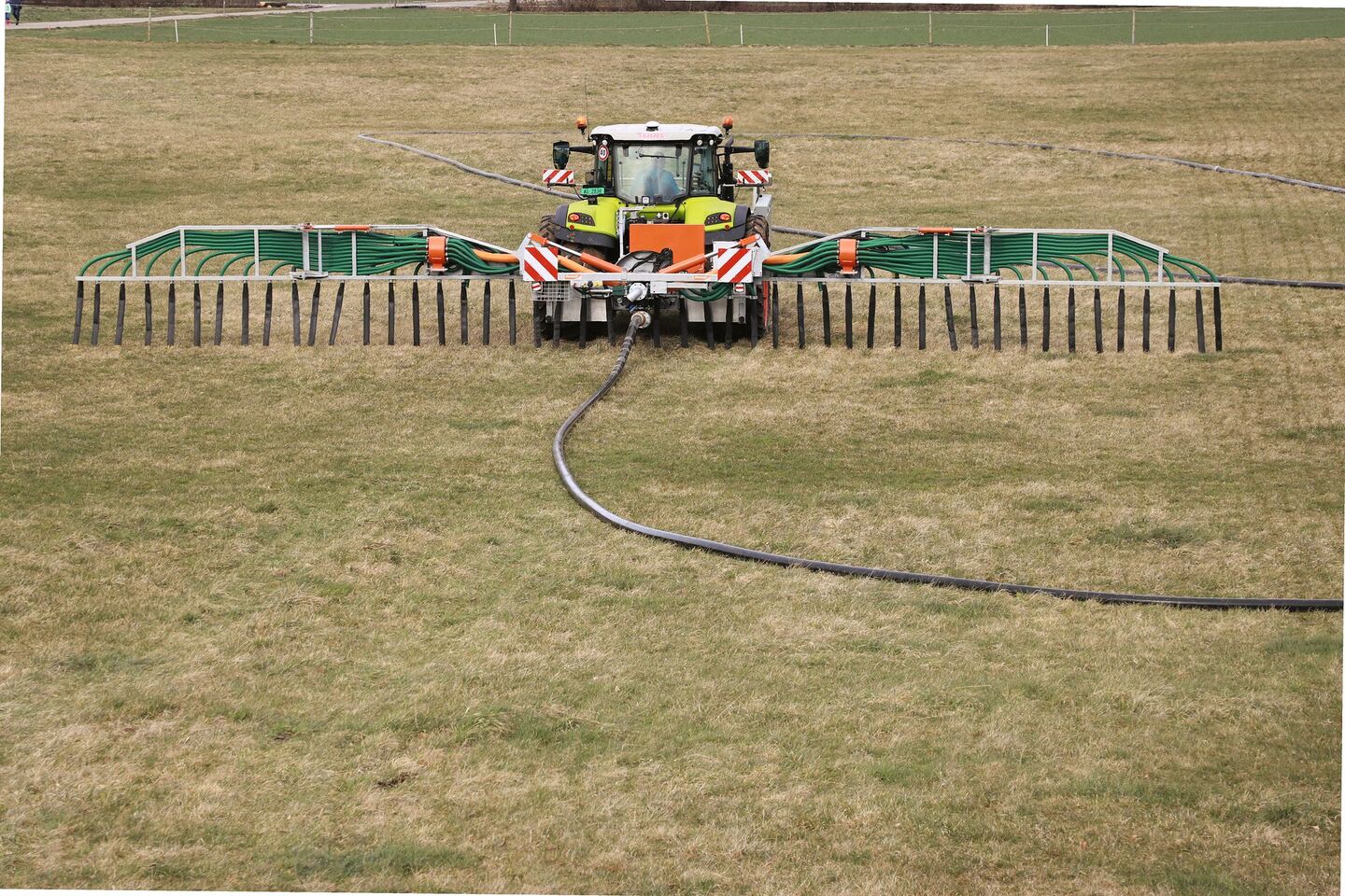 Das ermöglicht, dass höhere Güllegaben (40 bis 50 m3 pro Hektare) gegeben werden können. Das ist auch wirtschaftlich interessant wenn Arbeitsschritte zusammengenommen werden können. Gerade, wenn Gülle aufwändig verschlaucht wird.