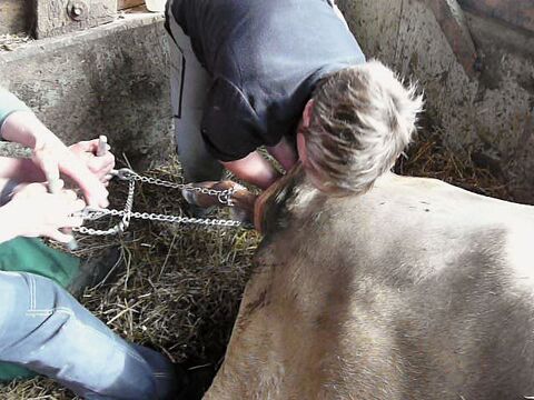 Vor dem ersten Kontrollgriff ist die Hinterpartie der Kuh und vor jedem Kontrollgriff sind die Hände und Arme des Geburtshelfers gründlich mit Seife, Bürste und warmem Wasser zu reinigen (Einmalhandschuhe und Gleitgel benutzen).