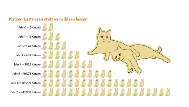Katzen werden bereits mit sechs Monaten geschlechtsreif. Unsere Grafik zeigt, wie schnell es geht, bis aus einem Katzenpaar mehrere Tausend Katzen werden. Dagegen hilft die Kastration der Haustiere.