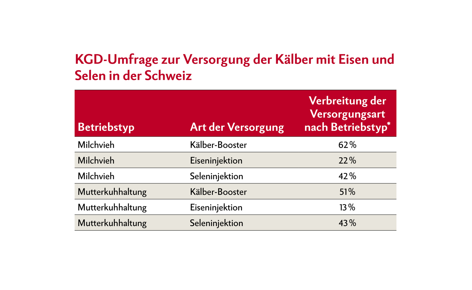 Von den teilnehmenden Milchvieh-Betrieben verabreichten 62 % routinemässig einen Kälber-Booster. Auf 22 % der Betriebe erhielten Kälber eine Eiseninjektion und auf 42 % eine Seleninjektion. Auf den Mutterkuh-Betrieben gaben 51 % der Betriebe den Kälber-Booster und 13 % die Eiseninjektion. Die Injektion von Selen war auf 43 % aller Mutterkuh-Betriebe Routine und damit ähnlich verbreitet wie auf Milchvieh-Betrieben.