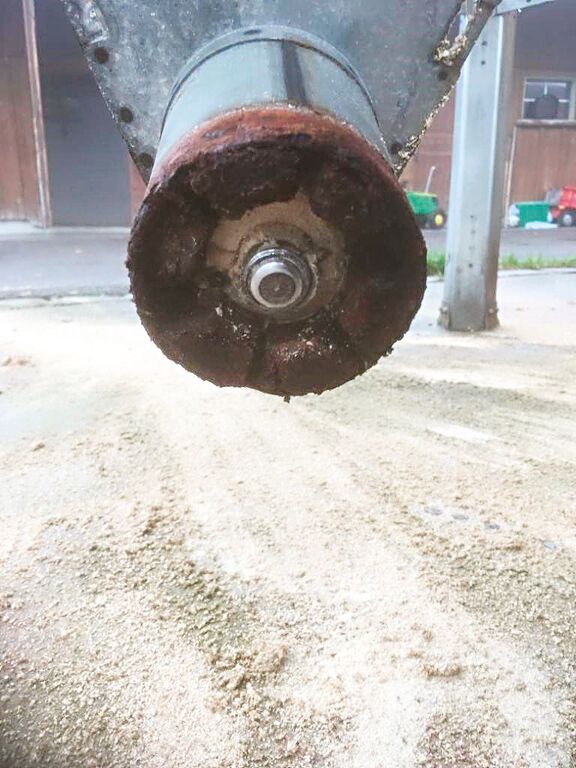 Dann kam die Sprache auf die Futtersilos. Frau Meier hat zwei Metallsilos, die draussen stehen. Die Futterschnecke ist über ein kleines «Fenster» zugänglich. Die Silos wurden immer wieder, kurz bevor diese leer wurden, befüllt und somit noch nie gereinigt. Dies gilt auch für die Futterschnecke.