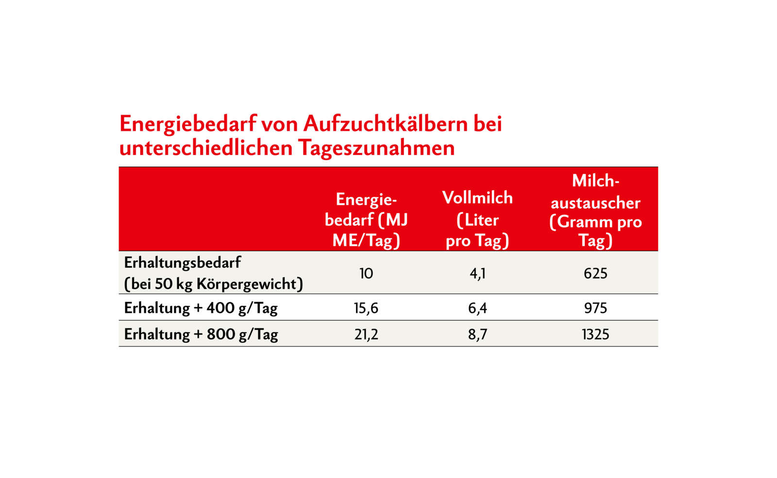 Da ist die Antwort einfach: lieber ein bisschen zu viel als viel zu wenig! Ein intensives Wachstum, wie wir es uns wünschen, erfordert das Vertränken von mindestens neun Liter Milch pro Tag. Berücksichtigt man, dass ein Liter Milch bezüglich des Energiegehalts etwa 160 g Milchaustauscher (MAT) entspricht, so müssen entsprechend etwa 1,4 kg pro Kalb und Tag vertränkt werden.