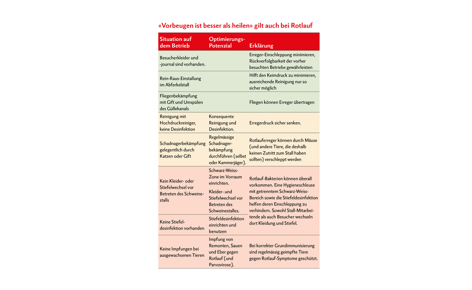 - Konsequente Hygiene und Impfung des Tierbestandes senken das Risiko für Rotlauf-Symptome.